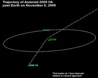 Small Asteroid 2009 VA Whizzes By The EarthPasadena CA (SPX) Nov 11, 2009 A newly discovered asteroid designated 2009 VA, which is only about 7 meters in size, passed about 2 Earth radii (14,000 km) from the Earth's surface Nov. 6 at around 16:30 EST. This is the third-closest known (non-impacting) Earth approach on record for a cataloged asteroid. The two closer approaches include the 1-meter sized asteroid 2008 TS26, which passed within 6,150 km of the Earth's ... read more |