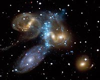 A Galaxy Collision In ActionBoston MA (SPX) Jul 10, 2009 This beautiful image gives a new look at Stephan's Quintet, a compact group of galaxies discovered about 130 years ago and located about 280 million light years from Earth. The curved, light blue ridge running down the center of the image shows X-ray data from the Chandra X-ray Observatory. Four of the galaxies in the group are visible in the optical image (yellow, red, white and blue) ... read more |