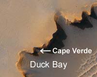 Pasadena CA (JPL) Jun 18, 2007 Right now, Opportunity is safely perched on "Cape Verde" and is observing "Duck Bay" from above. The rover drove four out of the last five sols, covering 196.44 meters (644 feet). The fifth and final D-star (drive software) checkout step ran successfully on Opportunity on sol 1200. The dynamic path planner added in the latest flight software version is now ready for use. On sol 1204, the post-drive robotic arm unstow stopped short of completion due to an excess attitude change. The actual attitude change fell well within the 5-degree limit and is consistent with a robotic arm unstow activity. The engineering team traced the miscalculation to a possible bug in the flight software and a full investigation is underway. Sol-by-sol summary: Each sol contains: panoramic camera tau measurement and miniature thermal emission spectrometer mini sky observation and long ground calibration during the engineering block; pre-Odyssey panoramic camera tau and miniature thermal emission spectrometer sky and long ground calibration during the Odyssey pass. Drive sols contain robotic arm stow and unstow before and after the drive. Sol 1200: On this sol, Opportunity drove about 60 meters (197 feet), then executed the fifth and final D-star checkout. After the drive, the rover took a post-drive panoramic camera tau measurement. Sol 1201: After solar array wakeup, Opportunity's panoramic camera conducted a sky survey. The rover then drove 12.36 meters (41 feet) using autonav. After the drive, Opportunity took images with its navigation and panoramic cameras. After the Odyssey pass, the rover conducted an alpha particle X-ray spectrometer integration as part of an Argon experiment. Sol 1202: In the morning of this sol, Opportunity's panoramic camera took thumbnail images of the sky. The rover then drove 41.56 meters (136 feet) toward Cape Verde, conducted a quick fine attitude update (to confirm its exact location) and did post-drive imaging. Sol 1203: On the morning of this sol, the rover took navigation camera images in the rearward direction and conducted a miniature thermal emission spectrometer sky and ground observation. The navigation camera then had a look for clouds and the panoramic camera also surveyed the sky. The miniature thermal emission spectrometer did a sky and ground observation in the morning as well. The rover then drove 66.23 meters (convert) to a stand-off point near Cape Verde. After the drive, Opportunity took post-drive images with its panoramic, hazard avoidance and navigation cameras. Sol 1204: After solar array wakeup, the rover's panoramic camera conducted a 13-filter systematic foreground survey. The miniature thermal emission spectrometer performed a sky and ground observation. The rover then drove south 7.84 meters (26 feet) onto Cape Verde to image the first eye of a stereo image of an area in the middle of Duck Bay. After the drive, Opportunity took images with its panoramic, hazard avoidance and navigation cameras. Sol 1205: In the morning of this sol, Opportunity's miniature thermal emission spectrometer conducted a sky and ground observation. The panoramic camera surveyed the horizon. The rover also took images with its hazard avoidance camera and finished up the long baseline stereo image it began the sol before. Opportunity's total odometry as of sol 1204 is 11,369.33 meters (7.06 miles). Community Email This Article Comment On This Article Related Links Mars Rovers at JPL Mars Rovers at Cornell Mars News and Information at MarsDaily.com Lunar Dreams and more