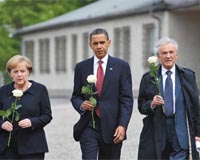 Berlin (UPI) Jun 5, 2009 On April 11, 1945, at 3:15 p.m., the eldest inmate of the Nazi concentration camp Buchenwald stepped in front of a loudspeaker, an instrument that until then had only broadcast orders of the SS, and spoke four words: "Comrades, we are free." That same day, U.S. troops had liberated this camp near Weimar, in eastern Germany. For an estimated 56,000 inmates, help came too late -- they had already died at the hands of the Nazis. But the clock at Buchenwald is still there today. Its hands are frozen in the position of 3:15 p.m. On Friday, Barack Obama became the first U.S. president to visit Buchenwald. The visit came a day after he had reached out to the Muslim world in a speech in Cairo, and just hours after he and German Chancellor Angela Merkel renewed calls for urgent action to bring peace to the Middle East. Flanked by Merkel and former Buchenwald inmates Bertrand Herz and Eli Wiesel, a Nobel laureate, Obama entered the camp through its large gate building, which the Nazis had marked with the cynical line "Jedem das Seine" -- "To each his own." They paused to lay white roses at a memorial tablet noting the nationalities of the 250,000 people that had been detained here in total -- Jews, but also political dissidents, homosexuals, Sinti and Roma -- and then walked across the vast space where the wooden barracks that housed them once stood. By the end of World War II, Buchenwald was the largest concentration camp on German soil. The group continued on to the so-called Kleines Lager (small camp), where thousands of people died in the final weeks before the liberation. Here, inmates too weak to work were rounded up in stables. "They were made for 50 horses, but they put us in, hundreds of us," Arek Hersh, a survivor, told ARD television. "And so you died." Wiesel's father died here in Buchenwald, and the Nobel laureate later said his grave was "somewhere in the sky, which has become the largest cemetery of the Jewish people." Obama appeared shaken and paused many times to ask questions of the survivors. The group finished the tour of Buchenwald at its dark heart, the crematorium, where the bodies were burned. The president's great-uncle, Charles Payne, was among the U.S. troops who liberated Ohrdruf, a nearby satellite camp to Buchenwald. Obama has previously said that Payne has had difficulties dealing with what he saw there. "More than half a century later, our grief and our outrage have not diminished," Obama said after the tour. "I will not forget what I have seen today." Obama added that Buchenwald was the "ultimate rebuke" to those people still denying the Holocaust, "a denial of fact and truth that is baseless and ignorant and hateful." Merkel spoke of "the obligations placed on Germany as a result of our past" and vowed that "we Germans are united by the strong will that such a thing can never happen again." But Wiesel reminded both leaders that those had been empty promises. "Had the world learned, there would have been no Cambodia and no Rwanda and no Darfur and no Bosnia," Wiesel said. "Will the world ever learn?" In a joint news conference with Merkel earlier Friday in Dresden, Obama was asked whether he had done enough to stop genocide in Sudan's Darfur region. Obama said he had appointed one of his key national security advisers, Gen. Scott Gration, as a special envoy to the conflict there. Sudanese President Omar al-Bashir has expelled humanitarian workers from the country where aid groups have warned genocide continues. Gration is tasked with trying to "not only solve the immediate humanitarian crisis that exists," but also to "reactivate the possibilities of a peace settlement between Khartoum and some of the rebels in Darfur that would allow the internally displaced people from Darfur to start returning to their homes." Earlier Friday Obama toured Dresden's historic city center and attended a ceremony in the Church of our Lady, a baroque jewel that was destroyed by Allied firebombing in 1945 but was later rebuilt thanks in part to U.S. donors. "All of humanity hopes for peace in a place like this where everyone can see that reconciliation between former enemies is possible," Bishop Jochen Bohl said at the ceremony. From Buchenwald, Obama flew to Ramstein Air Base and Landstuhl Medical Center to meet with U.S. troops wounded in Afghanistan and Iraq. He will continue on to France to attend ceremonies marking the 65th anniversary of the D-Day landings. Share This Article With Planet Earth
