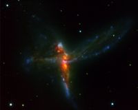 Paris, France (ESA) Jan 02, 2008 Using ESO's Very Large Telescope, an international team of astronomers has discovered a stunning rare case of a triple merger of galaxies. This system, which astronomers have dubbed 'The Bird' - albeit it also bears resemblance with a cosmic Tinker Bell - is composed of two massive spiral galaxies and a third irregular galaxy. The galaxy ESO 593-IG 008, or IRAS 19115-2124, was previously merely known as an interacting pair of galaxies at a distance of 650 million light-years. But surprises were revealed by observations made with the NACO instrument attached to ESO's VLT, which peered through the all-pervasive dust clouds, using adaptive optics to resolve the finest details. Underneath the chaotic appearance of the optical Hubble images - retrieved from the Hubble Space Telescope archive - the NACO images show two unmistakable galaxies, one a barred spiral while the other is more irregular. The surprise lay in the clear identification of a third, clearly separate component, an irregular, yet fairly massive galaxy that seems to be forming stars at a frantic rate. "Examples of mergers of three galaxies of roughly similar sizes are rare," says Petri Vaisanen, lead author of the paper reporting the results. "Only the near-infrared VLT observations made it possible to identify the triple merger nature of the system in this case." Because of the resemblance of the system to a bird, the object was dubbed as such, with the 'head' being the third component, and the 'heart' and 'body' making the two major galaxy nuclei in-between of tidal tails, the 'wings'. The latter extend more than 100,000 light- years, or the size of our own Milky Way. Subsequent optical spectroscopy with the new Southern African Large Telescope, and archive mid-infrared data from the NASA Spitzer space observatory, confirmed the separate nature of the 'head', but also added further surprises. The 'head' and major parts of the 'Bird' are moving apart at more than 400 km/s (1.4 million km/h!). Observing such high velocities is very rare in merging galaxies. Also, the 'head' appears to be the major source of infrared luminosity in the system, though it is the smallest of the three galaxies. "It seems that NACO has caught the action right at the time of the first high-speed fly-by of the 'head' galaxy through the system consisting of the other two galaxies," says Seppo Mattila, member of the discovery team. "These two galaxies must have met earlier, probably a couple of hundred million years ago." The 'head' is forming stars violently, at a rate of nearly 200 solar masses per year, while the other two galaxies appear to be at a more quiescent epoch of their interaction-induced star formation history. The 'Bird' belongs to the prestigious family of luminous infrared galaxies, with an infrared luminosity nearly one thousand billion times that of the Sun. This family of galaxies has long been thought to signpost important events in galaxy evolution, such as mergers of galaxies, which in turn trigger bursts of star formation, and may eventually lead to the formation of a single elliptical galaxy.