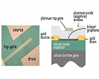 Constructing a bilayer graphene transistor Previously, in 2006, researchers at Berkeley Lab's Advanced Light Source (ALS) observed a bandgap in bilayer graphene in which one of the layers was chemically doped by adsorbed metal atoms. But such chemical doping is uncontrolled and not compatible with device applications. "Creating and especially controlling a bandgap in bilayer graphene has been an outstanding goal," says Wang. "Unfortunately chemical doping is difficult to control." Researchers then tried to tune the bilayer graphene bandgap by doping the substrate electrically instead of chemically, using a perpendicularly applied, continuously tunable electrical field. But when such a field is applied with a single gate (electrode), the bilayer becomes insulating only at temperatures below one degree Kelvin, near absolute zero - suggesting a bandgap value much lower than predicted by theory. Says Wang, "With these results it was hard to understand exactly what was happening electronically, or why." Wang and his colleagues made two key decisions that led to their successful attempt to introduce and determine a bandgap in bilayer graphene. The first was to build a two-gated bilayer device, fabricated by Yuanbo Zhang and Tsung-Ta Tang of the UC Berkeley Department of Physics, which allowed the team to independently adjust the electronic bandgap and the charge doping. The device was a dual-gated field-effect transistor (FET), a type of transistor that controls the flow of electrons from a source to a drain with electric fields shaped by the gate electrodes. Their nano-FET used a silicon substrate as the bottom gate, with a thin insulating layer of silicon dioxide between it and the stacked graphene layers. A transparent layer of aluminum oxide (sapphire) lay over the graphene bilayer; on top of that was the top gate, made of platinum. The other key decision the researchers made was to get a better grasp of what was really going on in the device as they varied the voltage. Rather than try to measure the bandgap by measuring the device's electrical resistance, or transport, they decided to measure its optical transmission. "The problem with transport measurements is that they are too sensitive to defects," says Wang. "A tiny amount of impurity or defect doping can create a big change in the resistance of the graphene and mask the intrinsic behavior of the material. That's why we decided to go with optical measurements at the Advanced Light Source." Using infrared beamline 1.4 at the ALS, under the direction of ALS physicist Michael Martin and Zhao Hao of the Earth Sciences Division, Wang and his colleagues were able to send a tight beam of synchrotron light, focused on the graphene layers, right through the device. As the researchers tuned the electrical fields by precisely varying the voltage of the gate electrodes, they were able to measure variations in the light absorbed by the gated graphene layers. The absorption peak in each spectrum provided a direct measurement of the bandgap at each gate voltage. "In principle we could have used a tunable laser to measure the optical transmission, but the 1.4 beamline is very bright and can be focused down to the diffraction limit - an important consideration when the graphene-flake target is so small," Wang says. "Also, compared to a laser, the beamline provides a wider range of frequencies all at once, so we don't have to painstakingly tune to each absorption frequency we're trying to measure."