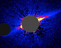 Kamuela HI (SPX) Jul 20, 2007 Astronomers using the W. M. Keck Observatory and NASA's Hubble Space Telescope to study disks of debris around stars have found one that is extremely lopsided. While scientists are accustomed to finding asymmetrical accumulations of dust and larger bodies around stars, the debris disk around a star known as HD 15115 has a needle-like shape. Astronomers believe the shape of debris disks can be affected by extrasolar planets or nearby stars on very elliptical orbits. Researchers are studying whether the gravity of a star known as HIP 12545, located about 10 light years from HD 15115, is the reason for the needle formation which appears blue when viewed in optical light with Hubble and near-infrared light with Keck. While protoplanetary disks around young stars are thought to be the basis for the birth of planets, debris disks such as the one around HD 15115 are believed to be made up of the remnants of planet production. They are also similar to the Kuiper Belt, the region of our solar system extending from and beyond the orbit of Neptune that contains numerous objects made up of rock and ice. About 800 of those objects have been identified in recent years including a number of dwarf planets which the International Astronomical Union last year ruled also includes Pluto. Astronomers believe debris disks, which are replenished by dust from collisions among its member objects, also can be affected by planets nearer to the star, much as Neptune's gravity can have an effect on Kuiper Belt objects. Paul Kalas, lead author of a study on HD 15115, cited one theory about planet-disk interaction closer to home as an example of how the needle formed. Some astronomers have developed a theory that Neptune originally formed between Saturn and Uranus, but was eventually kicked out to its present location beyond Uranus by a gravitational dance between Saturn and Jupiter before their orbits stabilized. "Therefore, we speculate that if such a planetary upheaval were occurring around HD 15115 at the present time, it could explain the highly asymmetric disk," Kalas said. The disk around HD 15115, which is the result of its highly elliptical orbit, is believed to begin at about the same distance from its star as the Kuiper Belt does from our Sun, but extends outward by at least ten times farther. The outer extend of the Blue Needle is detected to at least 550 AU making it the second-most extended debris disk seen to date. Dusty disks are known to exist around at least 100 stars, but because of the difficulty in observing material close to the brightness of a star, less than a dozen have been studied closely. But the installation of the Advanced Camera for Surveys aboard the Hubble -before it malfunctioned early this year - led to increased discoveries of debris disks over the past three years. Kalas said while the Hubble has been used to survey debris disks in optical light, Keck has been invaluable for more detailed analysis in infrared wavelengths and to image the regions close to the star, where planet formation may have occurred. From the evidence so far, Kalas considers both HD 15115 and HIP 12545 to be among nearly 30 stars that belong to the Beta Pictoris Moving Group. Moving groups are expanded clusters of stars believed to have a common birthplace and age, in this case about 12 million years, which are moving together loosely through space. HD 15115 has many similarities to another star know as AU Microscopii, a closely studied member of the Beta Pictoris Moving Group Located 32 light years form earth. However, the debris disk around HD 15115 is not only far more asymmetrical than those observed around three other stars in the group, it also has significantly less dust than two of them of similar mass. Kalas said that the missing material might be related to the process that created the needle formation. "The missing mass is quite interesting," he said. "Perhaps the mechanism which perturbed the disk into its current asymmetric morphology also shaved away a significant fraction of the mass." The dusty disk around HD 15115 was first indirectly detected in 2000 and first imaged using the Hubble Space Telescope in July 2006. The disk's needle-like shape was extremely unusual, prompting the astronomers to request observations at W.M. Keck Observatory to confirm the disk's existence and to image it closer to the star than was possible with Hubble. When the Keck near-infrared images were compared to the Hubble optical images, the disk was found to have an extremely blue color, which is also relatively rare among such disks. It was investigated further using Keck adaptive optics last year. It is not yet known whether HIP 12545, the suspected gravitational perturber, has its own dusty disk. Kalas hopes to take advantage of Keck's adaptive optics - which removes the distortions caused by the Earth's atmosphere - to investigate that further this fall. HD 15115 is classified as an "F" star, slightly larger than the Sun. HIP 12545 is an M star which has roughly half as much mass as the Sun. As the discovery of Beta Pictoris a decade ago resulted in more than 300 scientific papers, Kalas believes that the research of HD 15115 will prompt a wealth of follow-up observations. Questions remaining to be answered include whether the needle formation is a temporary phenomenon. "The blue needle presents a host of new challenges for theorists," Kalas said. Funding for the project was provided by NASA. The research on HD 15115, has been accepted for publication in Astrophysical Journal Letters. The study was co-authored by James Graham, like Kalas an astronomer at the University of California at Berkeley and the Center for Adaptive Optics at the University of California at Santa Cruz, with graduate student Michael P. Fitzgerald. Community Email This Article Comment On This Article Related Links W. M. Keck Observatory Lands Beyond Beyond - extra solar planets - news and science Life Beyond Earth