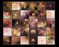 Boston MA (SPX) Dec 15, 2009 A collection of 30 never-before-released images of embryonic planetary systems in the Orion Nebula are the highlight of the longest single Hubble Space Telescope project ever dedicated to the topic of star and planet formation. Also known as proplyds, or protoplanetary discs, these modest blobs surrounding baby stars are shedding light on the mechanism behind planet formation. Only the NASA/ESA Hubble Space Telescope, with its high resolution and sensitivity, can take such detailed pictures of circumstellar discs at optical wavelengths. Looking like a graceful watercolour painting, the Orion Nebula is one of the most photogenic objects in space and one of the Hubble Space Telescope's favourite targets. As newborn stars emerge from the nebula's mixture of gas and dust, protoplanetary discs, also known as proplyds, form around them: the centre of the spinning disc heats up and becomes a new star, but remnants around the outskirts of the disc attract other bits of dust and clump together. Proplyds are thought to be young planetary systems in the making. In an ambitious survey of the familiar nebula using Hubble's Advanced Camera for Surveys (ACS), researchers have discovered 42 protoplanetary discs. Visible to the naked eye, the Orion Nebula has been known since ancient times, but was first described in the early 17th century by the French astronomer Nicolas-Claude Fabri de Peiresc - who is given credit for discovering it. At 1500 light-years away, the nebula, also known as Messier 42, is the closest star-forming region to Earth with stars massive enough to heat up the surrounding gas, setting it ablaze with colour, and making the region stand out to stargazers. Within the awe-inspiring, gaseous folds of Orion, researchers have identified two different types of discs around young and forming stars: those that lie close to the brightest star in the cluster (Theta 1 Orionis C) and those farther away from it. This bright star heats up the gas in nearby discs, causing them to shine brightly. Discs that are farther away do not receive enough energetic radiation from the star to heat up the gas and so they can only be detected as dark silhouettes against the background of the bright nebula, as the dust that surrounds these discs absorbs background visible light. By studying these silhouetted discs, astronomers are better able to characterize the properties of the dust grains that are thought to bind together and possibly form planets like our own. The brighter discs are indicated by a glowing cusp in the excited material and facing the bright star, but which we see at a random orientation within the nebula, so some appear edge on, and others face on, for instance. Other interesting features enhance the look of these captivating objects, such as emerging jets of matter and shock waves. The dramatic shock waves are formed when the stellar wind from the nearby massive star collides with the gas in the nebula, sculpting boomerang shapes or arrows or even, in the case of 181-825, a space jellyfish! It is relatively rare to see visible images of proplyds, but the high resolution and sensitivity of Hubble and the Orion Nebula's proximity to Earth allow for precise views of these potential planetary systems. This proplyd atlas is the first scientific outcome from the HST Treasury Program on the Orion Nebula. Treasury Programs are carried out to allow scientists to conduct comprehensive studies over longer periods since time on the in-demand Hubble Space Telescope is strictly allocated. High resolution imaging of protoplanetary discs is an example of a science discovery that has led to better technology and is one of the main science cases for the Atacama Large Millimeter/submillimeter Array (ALMA), one of the largest ground-based astronomy projects of the next decade. ALMA will observe the dust at longer wavelengths, in emission (instead of in absorption as we see it at optical wavelengths) with an angular resolution up to 10 times better than that of Hubble. Share This Article With Planet Earth
