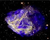 Stellar Shrapnel Seen In Aftermath Of ExplosionBoston MA (SPX) May 25, 2010 This beautiful composite image shows N49, the aftermath of a supernova explosion in the Large Magellanic Cloud. A new long observation from NASA's Chandra X-ray Observatory, shown in blue, reveals evidence for a bullet-shaped object being blown out of a debris field left over from an exploded star. In order to detect this bullet, a team of researchers led by Sangwook Park of Penn State Uni ... read more |