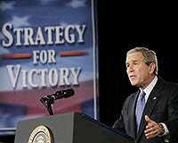 Al-Asad Air Base, Iraq (AFP) Sept 3, 2007 US President George W. Bush said during a surprise visit to Iraq on Monday that security could be maintained with fewer US troops if a turnaround in the restive province of Anbar continues. Bush made the remarks after a meeting of his "war council" with Prime Minister Nuri Al-Maliki and other senior Iraqi leaders just days before General David Petraeus and US Ambassador Ryan Crocker report to Congress on the US surge strategy. "General Petraeus and Ambassador Crocker tell me if the kind of success we are now seeing continues, it is possible to maintain the same level of security with fewer American forces," he said. But did not say how deeply or how quickly US forces can be cut, key questions that have been at the heart of an intensifying debate in the United States over the four-year-old war. Bush flew in on Air Force One to the dusty air base of Al-Asad in the desert west of Baghdad, in a region torn by a Sunni insurgency that in recent months has abruptly turned in Washington's favour. The president, who was joined in Iraq by his top national security advisers, was meeting with tribal sheikhs who have shifted allegiances against Al-Qaeda, blamed for most of the violence in the country since the March 2003 invasion. Bush's visit, only his third to Iraq since the invasion, was aimed at highlighting progress in the violence-wracked country ahead of a White House report to Congress due by September 15. Bush said the success in Anbar must be followed by the Maliki government, which has come under attack from some quarters in the United States over the failure to restore security. "I urge members of Congress to listen to what (Petraeus and Crocker) have to say," Bush said.