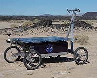 for Astrobiology Magazine Moffett Field CA (SPX) Feb 05, 2008 On a dry lakebed in the Mojave desert, a small experimental rover named Zoe wanders back and forth between dusty clay sediments and black fields of basaltic lava, belched out during eruptions that formed the nearby cinder cone, Amboy Crater. Atop a small rise in the landscape, in the shade of a six-foot-square canopy, a quartet of researchers sit in folding chairs, portable computers on their laps, alternately scanning screens of status data transmitted by Zoe, discussing the robot's behavior, and writing on-the-spot patches to its control software. Zoe carries with it, on a hard disk, a crude map of the region it's exploring, based on data collected by ASTER, an infrared spectrometer onboard NASA's Earth Observing Satellite. Zoe's goal is to produce a more-detailed map that clearly defines the boundaries between areas of the terrain dominated by clay and those dominated by basalt. It would be a relatively simple matter for a field geologist to do this work. But what the Carnegie Mellon University researchers who are part of this Science on the Fly experiment want to know is: can a robot can do it too? To members of the CMU team, it's obvious that the crumbly brown stuff is clay and the hard black stuff is basalt. Color and texture make the distinction clear in an instant. The researchers have purposely picked a simple landscape for their test, dominated by two distinct rock types. Many geologic settings are more complex, but they wanted to give Zoe a relatively clear task on its first full field trial. If Zoe can learn to perform its task here, one day a more-refined version of its software could be used on a robotic mission to Mars, where geologists are not likely to be wandering about any time soon. But unlike humans, Zoe can't easily tell basalt from clay just by looking at color and texture. Instead, the robot relies primarily on spectral data, which can be ambiguous. Every type of mineral, such as quartz, or mica, absorbs light at certain frequencies and reflects it at others. This absorption and reflectance pattern is known as a spectral signature and distinguishes one mineral from another. A graph of this spectral response looks like a series of peaks and valleys. Rocks, such as volcanic basalts, or clay sediments, are mixtures of minerals, and so their spectral signatures are also mixtures. This can make identification more difficult, because different combinations of minerals can produce similar spectral signatures. So Zoe focuses on a handful of spectral frequencies, many of them in infrared wavelengths, at which basalt and clay are clearly distinct. On each of its traverses, Zoe attempts to build a detailed map of an area ranging from 30,000 to 75,000 square meters (about 7.5 to 18.5 acres). The robot can't cover the entire area; rather it winds along a narrow path of its own choosing, up to a kilometer (six-tenths of a mile) long, moving about one meter, and taking one spectral image, per second. Each time it captures an image, it rebuilds its map. It analyzes every pixel, identifying it as either basalt, or clay, or still-unknown, and assigning a confidence level to its classification. Then it decides where to go next. (Zoe doesn't actually distinguish between "basalt" and "clay"; it knows only that they are two different classes of rocks, with different spectral signatures. It needs a geologist to decide what types of rock they are. ) The hard part is choosing the most effective path, the path that will yield the greatest amount of information. Ideally, Zoe wants to go directly to the place it knows least about. But there are some obstacles. For one thing, the most ambiguous part of the map may be far away. So the robot needs to figure out how to do useful science on its way to getting there. CMU roboticist David Wettergreen explained the problem by analogy to a football field. Imagine, he said, you had just stepped onto one corner of the field and you wanted to know as much as possible about the entire field. "If you were unconstrained by time and space, you might hop to the far corner. And then, having seen that, you might hop to the 50-yard-line. But that's not a practical way to explore. I might know the least about that far corner, but I have to take one step. So how to take that one step is the problem that we're trying to solve here with the robot." Zoe also has to avoid obstacles, such as steep hills - and bushes. When the CMU team scouted the Amboy Crater area, there were some creosote bushes scattered about, but they were dry and leafless - from Zoe's point of view, too insubstantial to pay attention to. Then it rained, and the bushes leafed out, making them more formidable obstacles, which Zoe had to be taught to drive around. Wettergreen is pleased with the success of the Science on the Fly field test. In an email after the field work wrapped up, he wrote that, although a great deal of development remained to be done before software like Zoe's could be used to guide a rover on Mars, the "system demonstrated many of the 'common sense' intuitions that field geologists take for granted: spatial awareness, the ability to correlate surface and orbital views, [and] a tendency to seek novel data." One aspect of Zoe's software, however, is closer to being ready for prime time: the use of far-field sensing - looking off into the distance, rather than looking just a few feet ahead - to help figure out how to avoid obstacles. Far-field sensing may seem like a no-brainer to us - we do it all the time - but it actually involves quite a bit of brainpower. That's what makes it challenging for a robot. Nevertheless, says Wettergreen, he and his colleagues now "have proven the concept." What remains is "to test, test, test." The Science on the Fly project was funded by NASA's ASTEP (Astrobiology Science and Technology for Exploring Planets) program. Community Email This Article Comment On This Article Related Links A