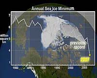 Boulder CO (SPX) Oct 04, 2007Arctic sea ice during the 2007 melt season plummeted to the lowest levels since satellite measurements began in 1979, according to researchers at the University of Colorado at Boulder's National Snow and Ice Data Center. The average sea ice extent for the month of September was 1.65 million square miles (4.28 million square kilometers), the lowest September on record, shattering the previous record for the month by 23 percent, which was set in 2005. At the end of the melt season, September 2007 sea ice was 39 percent below the long-term average from 1979 to 2000. |
