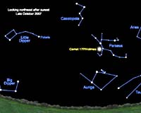 Pasadena CA (SPX) Nov 01, 2007 Usually comets are challenging little no-see-um fuzzballs. To see one often requires a dark sky, a good chart or a telescope that can "go-to" the object automatically. This week there is a newly visible comet in the sky and it can be seen with the unaided eye! Last week, Periodic comet Holmes (17P/Holmes), a very faint comet far from the sun experienced an outburst and brightened a million times in just a few hours. The comet puffed up (it's still expanding), changed color and wowed viewers around the world. The Astronomy Photo of the day for October 30 (visit: http://antwrp.gsfc.nasa.gov/apod/ap071030.html) shows the comet's current apparent size in the sky - compared to Jupiter, which you can also see in the west after sunset. To see the comet, all you have to do is step outside and look to the Northeast. You should be able to see the "W" that is the constellation Cassiopeia - it's standing on its end. One and a half "fists" away to the right is a bright star in the constellation Perseus. You probably won't be able to see all the Perseus stars, but the bright one - Mirfak - should be visible. It marks the top of a triangle, which is about the size of your thumb held at arms length away. The triangle's lower left corner is the comet! Use our sky chart to help you find the comet. The comet will stay with us for a while, so weather permitting, you'll get a look this week or next. Community Email This Article Comment On This Article Related Links JPL Asteroid and Comet Mission News, Science and Technology