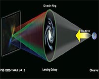 Washington DC (SPX) Oct 21, 2008 By cleverly unraveling the workings of a natural cosmic lens, astronomers have gained a rare glimpse of the violent assembly of a young galaxy in the early Universe. Their new picture suggests that the galaxy has collided with another, feeding a supermassive black hole and triggering a tremendous burst of star formation. The astronomers used the National Science Foundation's Very Large Array (VLA) radio telescope to look at a galaxy more than 12 billion light-years from Earth, seen as it was when the Universe was only about 15 percent of its current age. Between this galaxy and Earth lies another distant galaxy, so perfectly aligned along the line of sight that its gravity bends the light and radio waves from the farther object into a circle, or "Einstein Ring." This gravitational lens made it possible for the scientists to learn details of the young, distant galaxy that would have been unobtainable otherwise. "Nature provided us with a magnifying glass to peer into the workings of a nascent galaxy, providing an exciting look at the violent, messy process of building galaxies in the early history of the Universe," said Dominik Riechers, who led this project at the Max Planck Institute for Astronomy in Germany and now is a Hubble Fellow at the California Institute of Technology (Caltech). The new picture of the distant galaxy, dubbed PSS J2322+1944, shows a massive reservoir of gas, 16,000 light-years in diameter, that contains the raw material for building new stars. A supermassive black hole is voraciously eating material, and new stars are being born at the rate of nearly 700 Suns per year. By comparison, our Milky Way Galaxy produces the equivalent of about 3-4 Suns per year. The black hole appears to be near the edge, rather than at the center, of the giant gas reservoir, indicating, the astronomers say, that the galaxy has merged with another. "This whole picture, of massive galaxies and supermassive black holes assembling themselves through major galaxy mergers so early in the Universe, is a new paradigm in galaxy formation. This gravitationally lensed system allows us to see this process in unprecedented detail," said Chris Carilli, of the National Radio Astronomy Observatory. In 2003, astronomers studied PSS J2322+1944, finding the Einstein Ring by observing radio waves emitted by molecules of Carbon Monoxide (CO). When astronomers see large amounts of CO gas in a galaxy, they conclude that there also is a large amount of molecular Hydrogen present, and thus a large reservoir of fuel for star formation. In the latest study, scientists painstakingly produced a physical model of the lensing intermediate galaxy. By knowing the mass, structure and orientation of this galaxy, they could then deduce the details of how it bends the light and radio waves from the more-distant galaxy. This allowed them to reconstruct a picture of the distant object. By doing this with multiple VLA images made at different radio frequencies, they were able to measure the motions of the gas in the distant galaxy. "The lensing galaxy was, in effect, part of our telescope. By projecting backward through the lens, we determined the structure and dynamics of the galaxy behind it," said Fabian Walter of the Max-Planck Institute for Astronomy in Germany. PSS J2322+1944 was first discovered by George Djorgovski of Caltech, using the digitized Palomar Observatory Sky Survey. Later radio and optical studies showed that it had a huge reservoir of dust and molecular gas, and indicated gravitational lensing. Gravitational lenses were predicted, based on Albert Einstein's General Theory of Relativity, in 1919. Einstein himself showed in 1936 that a perfectly-aligned gravitational lens would produce a circular image, but felt that the chances of actually observing such an object were nearly zero. The first gravitational lens was discovered in 1979, and the first Einstein Ring was discovered by researchers using the VLA in 1987. Riechers, Carilli, and Walter worked with Brendon Brewer and Geraint Lewis of the University of Sydney in Australia, Frank Bertoldi of the University of Bonn in Germany, and Pierre Cox of the Institute of Millimeter Radio Astronomy in France. The scientists reported their findings in the October 20 edition of the Astrophysical Journal. The National Radio Astronomy Observatory is a facility of the National Science Foundation, operated under cooperative agreement by Associated Universities, Inc. Community Email This Article Comment On This Article Related Links Very Large Array (VLA) radio telescope Stellar Chemistry, The Universe And All Within It