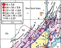 New York Earthquake Briefs And Quotes The wider forces at work include pressure exerted from continuing expansion of the mid-Atlantic Ridge thousands of miles to the east; slow westward migration of the North American continent; and the area's intricate labyrinth of old faults, sutures and zones of weakness caused by past collisions and rifting. Due to New York's past history, population density and fragile, interdependent infrastructure, a 2001 analysis by the Federal Emergency Management Agency ranks it the 11th most at-risk U.S. city for earthquake damage. Among those ahead: Los Angeles, San Francisco, Seattle and Portland. Behind: Salt Lake City, Sacramento, Anchorage. New York's first seismic station was set up at Fordham University in the 1920s. Lamont-Doherty Earth Observatory, in Palisades, N.Y., has operated stations since 1949, and now coordinates a network of about 40. Dozens of small quakes have been felt in the New York area. A Jan. 17, 2001 magnitude 2.4, centered in the Upper East Side-the first ever detected in Manhattan itself--may have originated on the 125th Street fault. Some people thought it was an explosion, but no one was harmed. The most recent felt quake, a magnitude 2.1 on July 28, 2008, was centered near Milford, N.J. Houses shook and a woman at St. Edward's Church said she felt the building rise up under her feet-but no damage was done. Questions about the seismic safety of the Indian Point nuclear power plant, which lies amid a metropolitan area of more than 20 million people, were raised in previous scientific papers in 1978 and 1985. Because the hard rocks under much of New York can build up a lot strain before breaking, researchers believe that modest faults as short as 1 to 10 kilometers can cause magnitude 5 or 6 quakes. In general, magnitude 3 quakes occur about 10 times more often than magnitude fours; 100 times more than magnitude fives; and so on. This principle is called the Gutenberg-Richter relationship. Community Email This Article Comment On This Article Related Links The Earth Institute at Columbia University Earth Institute at Columbia University Lamont-Doherty Earth Observatory Bringing Order To A World Of Disasters When the Earth Quakes A world of storm and tempest