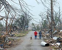 Washington (AFP) May 26, 2008 At least eight people were killed in the midwestern United States Sunday as a series of tornadoes swept through the region leaving behind a wake of destruction, CNN television reported. The network said seven people were found dead in northcentral Iowa, in the towns of Parkersburg and New Hartford when a tornado passed at about 6:00 pm (2200 GMT). Marble-sized hail also fell over Waterloo, where authorities reported significant damage to homes, trees and power lines, the report said. Iowa Governor Chet Culver declared a state of disaster in three counties. Meanwhile, in Minnesota, a separate twister killed a two-year-old child and seriously injured nine other people in the Minneapolis-Saint Paul area, CNN said. Community Email This Article Comment On This Article Related Links Weather News at TerraDaily.com