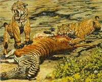 Los Angeles CA (SPX) Nov 06, 2008 The sabertooth cat (Smilodon fatalis), one of the most iconic extinct mammal species, was likely to be a social animal, living and hunting like lions today, according to new scientific research. The species is famous for its extremely long canine teeth, which reached up to seven inches in length and extended below the lower jaw. Instead of relying on the bones and teeth of the sabertooths to make their findings, scientists from UCLA and the Zoological Society of London concluded that the sabertooth cat was social by using a novel technique: They compared numbers of present-day carnivores competing for kills in Africa with those of mainly extinct species found in a North American fossil deposit. The research is published in the current issue of the Royal Society's journal Biology Letters (Oct. 28). Co-authors also included scientists from South Africa's Tshwane University of Technology and University of Pretoria. Smilodon existed in North and South America between 1.8 million and 10,000 years ago and is one of the most common species preserved at the Rancho La Brea tar pits of Los Angeles, a fossil deposit in which dying herbivores trapped in sticky asphalt attracted numerous dire wolves and sabertooth cats, some of which also died there. Because most living cats are solitary, controversy has persisted over the social life of Smilodon. The study reported in Biology Letters took a new approach to the question by comparing data from the La Brea fossil record and data obtained from "playbacks" used in Africa, in which the recorded calls of distressed prey and the sounds of lions and hyenas are used to attract carnivores. This technique has been used by scientists to estimate carnivore densities in eastern and southern Africa. Results showed that large social species made up a far larger proportion of the animals attracted than one would expect, considering their population size compared to other carnivores. Large social carnivores were, in fact, found to attend approximately 60 times more often than expected on the basis of relative abundance. When these results were compared with the records at the tar pits of California, the scientists found that the proportion of Smilodon records matched the proportion of the large social carnivores in the playbacks. "It absolutely makes sense that social species will predominate at carcasses, both now and in the past," said Blaire Van Valkenburgh, UCLA professor of ecology and evolutionary biology and senior author on the paper. "Why approach a situation where you are likely to encounter dangerous competitors without having a few friends along?" The same social advantage, she said, would apply to all scavengers, including early humans, who began consuming more meat about 2 million year ago, some of which they probably scavenged. Although commonly called the "sabertoothed tiger," the species is actually not closely related to the tiger, which is part of a different subfamily. However, the sabertooth cat was large and muscular, similar in size to a modern-day tiger. "The extinct sabertooth cat, Smilodon fatalis, has been something of an enigma, with almost nothing known of its behavior," said Chris Carbone, a senior research fellow at the Zoological Society of London and lead author of the paper. "This research allowed us to use the behavior of its present-day relatives to conclude that this extinct cat was more likely to roam in formidable gangs than as a secretive, solitary animal." Community Email This Article Comment On This Article Related Links University of California - Los Angeles Darwin Today At TerraDaily.com