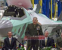 Fort Worth TX (SPX) Dec 20, 2007 Lockheed Martin F-35B Lightning II, the first fighter to combine stealth with short takeoff/vertical landing (STOVL) capability and supersonic speed, made its debut amid customers from the United States Marine Corps, the United Kingdom's Royal Navy and Royal Air Force, and the Italian Air Force and Navy. Attendees at the rollout ceremony in Lockheed Martin's Fort Worth assembly plant included Marine Corps Commandant Gen. James Conway. "The flexibility that the STOVL variant of the F-35 will add to the contemporary Marine Air Ground Task Force is amazing," Conway said. "This generational leap in technology will enable us to operate a fleet of fighter/attack aircraft from the decks of ships, existing runways or from unimproved surfaces at austere bases. We find that capability extremely valuable." The F-35B, designed to replace Marine Corps AV-8Bs and F/A-18s, is one of three variants of the Lightning II. Its first flight is planned for mid-2008, following a series of extensive ground tests. The F-35A conventional takeoff and landing version began its flight test program in December of 2006. The F-35C, designed for catapult launches and arrested recoveries aboard large U.S. Navy carriers, will make its inaugural flight in 2009. "Think F/A-18 speed and maneuverability, AV-8B forward deployment, F-22 stealth, and astonishing avionics," said Dan Crowley, Lockheed Martin executive vice president and F-35 program general manager. "It's a combination of technologies that may seem like science fiction, but our abundantly-talented international team has made it science fact." The heart of the F-35B is a STOVL propulsion system comprising the most powerful engine ever flown in a jet fighter, a shaft-driven counter-rotating lift fan situated behind the cockpit, a roll duct under each wing for lateral stability, and a rear 3-bearing swivel nozzle that vectors engine exhaust in the desired direction. During vertical or short takeoffs, or vertical landings, doors above and below the lift fan open, and a clutch connecting the lift fan to the engine drive shaft engages. A dorsal auxiliary engine inlet opens to increase airflow to the engine. At the same time, doors beneath the 3-bearing swivel nozzle open and the rear nozzle pivots downward, deflecting engine thrust toward the ground. Roll ducts under each wing also are engaged, keeping the aircraft laterally stable. In this configuration, the F-35B can hover, land vertically, take off in a few hundred feet fully loaded, or take off vertically with a light load. When the aircraft transitions from jet-borne to conventional wing-borne flight, the doors close and the pilot can then accelerate to supersonic speeds. The system is completely automatic. The Lockheed Martin X-35B successfully demonstrated the shaft-driven lift fan propulsion system in 2001, becoming the only aircraft in history to execute a short takeoff, level supersonic dash and vertical landing in a single flight. The Pratt and Whitney F135 engine will power the first series of F-35Bs. The F136, an interchangeable engine under development by the GE Rolls-Royce Fighter Engine Team, will make its first F-35 flight in 2010. Rolls-Royce produces the shaft-driven lift fan, 3-bearing swivel nozzle and roll duct systems. An additional six development STOVL F-35s are now in production across the worldwide F-35 supply chain. In 2007, long-lead procurement funds for the first six production STOVL aircraft were authorized, with the first Marine Corps training jets planned for a 2011 delivery. The F-35 Lightning II is a supersonic, multi-role, 5th generation stealth fighter designed to replace a wide range of existing aircraft, including AV-8Bs, A-10s, F-16s, F/A-18 Hornets and United Kingdom GR.7s and Sea Harriers. Lockheed Martin is developing the F-35 with its principal industrial partners, Northrop Grumman and BAE Systems. Two separate, interchangeable F-35 engines are under development: the Pratt and Whitney F135 and the GE Rolls-Royce Fighter Engine Team F136. Community Email This Article Comment On This Article Related Links The latest in Military Technology for the 21st century at SpaceWar.com