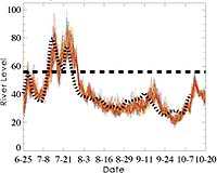 Protecting lives and income Almost every other year in recent decades, the Brahmaputra and Ganges rivers have flooded for periods ranging from a few days to a month or more, often with devastating results for local residents. Farmers and fishers can easily lose a year's worth of income in a single flood. Residents of the largely impoverished districts in the forecast area have said that advance notice of floods could help them ward off some of the worst impacts of rising waters. If they had sufficient warning, they could harvest at least a portion of their ripening crops, move some livestock to safety, encircle fish ponds with nets to prevent fish from escaping, and stock food and other supplies. "The goal here is to help very local, grassroots economies," Hopson explains. "The forecasts also alert relief agencies to prepare to bring in drinking water, cholera tablets, and other essentials in case of a major flood." The European Centre for Medium-Range Weather Forecasts provides data and weather forecasts, which are fed into hydrological models of the Ganges and Brahmaputra river basins. The system also incorporates estimates of precipitation from two satellite-based systems developed at the NASA Goddard Space Flight Center and NOAA Climate Prediction Center, along with discharge measurements of rivers in Bangladesh. The forecasting system emphasizes modeling and satellite data to compensate for a lack of river gauge data upstream of Bangladesh, as well as for a lack of radar data. It is updated daily with new model runs and measurements.