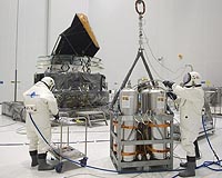 Kourou, French Guiana (ESA) Apr 23, 2009 Fuelling operations for the Planck spacecraft have been successfully completed last week. The filling of the propellant tanks with hydrazine liquid was performed in the S5A building at the Centre Spatial Guyanais (CSG) launch site on 15 and 16 April. On Saturday 11 April the Planck spacecraft was transferred from the S1B building, dedicated to spacecraft preparations, to the S5A building, dedicated to fuelling operations. Upon arrival at the airlock of the S5A building, the spacecraft was removed from the payload transport container (Conteneur Charge Utile, or CCU) that was used to maintain a cleanroom environment during the 5 km transfer from the S1B building. Still secured on its CCU pallet through the launcher adapter ring, Planck was rolled into the S5A cleanroom and readied for the hydrazine fuelling. The supply tanks containing liquid hydrazine (N2H4) were brought to the S5A building on 14 April. After being cleaned in the S5A airlock the tanks were brought into the cleanroom of the S5A building for the fuelling operations. Each tank has a capacity of 100 kg of liquid hydrazine, and four tanks were required to provide the 384 kg of propellant for the Planck spacecraft. The fuelling activity started on Wednesday, 15 April, and was performed by two specially trained operators in protective "scape suits", guided by colleagues who directed and monitored the operations from a nearby safety control room. The spacecraft's three fuel tanks were connected by filling pipes to the tank filling and pressurisation ground support equipment, a dedicated system used to perform and monitor the fuelling of the spacecraft. With the hydrazine supply tanks hanging on a load cell for continuous weight measurement the propellant was pumped under high pressure into the spacecraft's fuel tanks. A total of 384 kg (3�128 kg) of hydrazine propellant fuel was loaded into the fuel tanks in a process which took place during four shifts on 15 and 16 April. Once the tanks had been filled the fuelling equipment was disconnected and removed from the cleanroom. Upon confirmation that there were no hydrazine traces in the air, the propellant being a highly toxic and volatile fluid, the S5A cleanroom was opened again for normal use. The final stage of the fuelling operations involves the decontamination of all of the equipment that has been used for the fuelling operations. This means ensuring that the equipment is hydrazine-free at the level of 0.1 part-per-million before the equipment is packed, ready for shipment back to Europe. Share This Article With Planet Earth