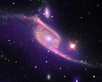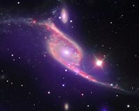 Boston MA (SPX) Dec 15, 2009 This composite image of data from three different telescopes shows an ongoing collision between two galaxies, NGC 6872 and IC 4970. X-ray data from NASA's Chandra X-ray Observatory is shown in purple, while Spitzer Space Telescope's infrared data is red and optical data from ESO's Very Large Telescope (VLT) is colored red, green and blue. Astronomers think that supermassive black holes exist at the center of most galaxies. Not only do the galaxies and black holes seem to co-exist, they are apparently inextricably linked in their evolution. To better understand this symbiotic relationship, scientists have turned to rapidly growing black holes - so-called active galactic nucleus (AGN) - to study how they are affected by their galactic environments. The latest data from Chandra and Spitzer show that IC 4970, the small galaxy at the top of the image, contains an AGN, but one that is heavily cocooned in gas and dust. This means in optical light telescopes, like the VLT, there is little to see. X-rays and infrared light, however, can penetrate this veil of material and reveal the light show that is generated as material heats up before falling onto the black hole (seen as a bright point-like source). Despite this obscuring gas and dust around IC 4970, the Chandra data suggest that there is not enough hot gas in IC 4970 to fuel the growth of the AGN. Where, then, does the food supply for this black hole come from? The answer lies with its partner galaxy, NGC 6872. These two galaxies are in the process of undergoing a collision, and the gravitational attraction from IC 4970 has likely pulled over some of NGC 6872's deep reservoir of cold gas (seen prominently in the Spitzer data), providing a new fuel supply to power the giant black hole. Share This Article With Planet Earth