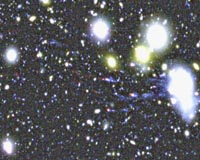 Hilo HI (SPX) Oct 07, 2008 We have all learned how plants and animals evolve over time, adapting and changing to better suit themselves to their environment. Well, the same things happen out in space in much larger and grander proportions galactic in scale. Our Milky Way galaxy is one of billions found in the observable Universe, and an interesting phenomenon is that ALL galaxies evolve by changing shape, size, and color. Understanding the evolutionary processes of galaxies is one of the most important issues in astronomy for which there are still fundamental problems to be solved. One straightforward approach is to study clusters of galaxies that contain several thousands to tens of thousands of galaxies. Galaxy Clusters are dense populations of galaxies, rich with hot intergalactic gas, accompanied by strong gravitational forces. These clusters are the best location to observe environmental effects in galactic evolution. To resolve the effect of the environment on the evolution of galaxies, a team of researchers from the National Astronomical Observatory of Japan and the University of Tokyo used Suprime-cam on the Subaru Telescope to observe the Coma Cluster of galaxies. The Coma Cluster contains over 1,000 galaxies and is fairly close to Earth at about 300 million light-years away. The central portion of the Cluster is inhabited by mostly elliptical galaxies, both dwarfs as well as giants. During observations in 2006 and 2007, it was by chance that astronomers at Subaru discovered a thread-like structure stretching from one of the galaxies. This filament, extending from Galaxy RB199 for about 260 thousand light-years, has many young stars surrounded by ionized gas that look like projectiles flying out from the galaxy. The research team called these knots "fireballs." Detailed study identified several bright knots connected by blue filamentary structures, and the knots were found to be clusters of young stars weighing 10 million Suns and contained in an area about 3,000 to 6,000 light-years across. Because the knots are accompanied by ionized gas, active star formation is going on in the fireballs where usually far less star formation would be expected. The team noted that the size and the mass of the fireballs indicate they could develop into dwarf galaxies. A question that developed during the study was what mechanism(s) stripped gas from Galaxy RB199 and created the fireballs? Because the inside of the cluster is crowded with galaxies, they pass by each other and crash into each other. The team thought that the tidal forces during such encounters could strip gas or stars from the galaxies. They also postulated that as a galaxy falls into the center of the cluster the gravitational forces of the cluster could remove the gas and stars from that galaxy. Both scenarios are possible, however, the research team found that these mechanisms could hardly explain the characteristics of the fireballs. The team then realized that ram pressure stripping occurs when superheated gas (several tens of million Kelvin) in the cluster and the galaxies collide at high speeds. Previous X-ray observation shows the presence of large amounts of hot ionized gas in the middle of the Coma Cluster while RB199 crashes into the center at a speed of 1,200 miles per second, causing strong friction with this hot gas. As such, the team concluded that the ram pressure has enough power to strip the gas from the galaxy AND create the fireballs. This study is the first to demonstrate that stripped gas turns into stars while traveling through remote space. While similar phenomena have been observed in galaxy clusters much further away at several billions light-years, those distant cases were interpreted through witnessing the transitional phase of galaxies changing their morphology or colors as they fall into a cluster. The fireballs discovered by this team of Japanese astronomers provide the first sample of such structures in a nearby cluster. Principal Investigator for the project, Dr. Michitoshi Yoshida said, "The team is confident that our study of these fireball phenomena leads to a better understanding of the gas stripping processes in galaxy clusters, and the effect of clusters on the evolution of individual galaxies." Community Email This Article Comment On This Article Related Links Subaru Telescope Stellar Chemistry, The Universe And All Within It