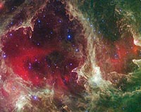 Pasadena CA (SPX) Aug 25, 2008 A new image from NASA's Spitzer Space Telescope tells a tale of life and death amidst a rich family history. The striking infrared picture shows a colorful cosmic cloud, called W5, studded with multiple generations of blazing stars. It also provides dramatic new evidence that massive stars -- through their brute winds and radiation -- can trigger the birth of stellar newborns. "Triggered star formation continues to be very hard to prove," said Xavier Koenig of the Harvard Smithsonian Center for Astrophysics in Cambridge, Mass. "But our preliminary analysis shows that the phenomenon can explain the multiple generations of stars seen in the W5 region." Koenig is lead author of a paper about the findings in the December 1, 2008, issue of the Astrophysical Journal. The most massive stars in the universe form out of thick clouds of gas and dust. The stars are so massive, ranging from 15 to about 60 times the mass of our sun, that some of their material slides off in the form of winds. The scorching-hot stars also blaze with intense radiation. Over time, both the wind and radiation blast away surrounding cloud material, carving out expanding cavities. Astronomers have long suspected that the carving of these cavities causes gas to compress into successive generations of new stars. As the cavities grow, it is believed that more and more stars arise along the cavities' expanding rims. The result is a radial "family tree" of stars, with the oldest in the middle of the cavity, and younger and younger stars farther out. Evidence for this theory can be seen easily in pictures of many star-forming regions, such as W5, Orion and Carina. For example, in the new Spitzer picture of W5, the most massive stars (some of the blue dots) are at the center of two hollow cavities, and younger stars (pink or white) are embedded in the elephant-trunk-like pillars as well as beyond the cavity rim. However, it is possible that the younger stars just happen to be near the edge of the cavities and were not triggered by the massive stars. Koenig and his colleagues set out to test the triggered star-formation theory by studying the ages of the stars in the W5 region. They used Spitzer's infrared vision to peer through the dusty clouds and get a better look at the stars' various stages of evolution. They found that stars within the W5 cavities are older than stars at the rims, and even older than stars farther out past the rim. This ladder-like separation of ages provides some of the best evidence yet that massive stars do, in fact, give rise to younger generations. "Our first look at this region suggests we are looking at one or two generations of stars that were triggered by the massive stars," said co-author Lori Allen of the Harvard-Smithsonian Center for Astrophysics. "We plan to follow up with even more detailed measurements of the stars' ages to see if there is a distinct time gap between the stars just inside and outside the rim." Millions of years from now, the massive stars in W5 will die in tremendous explosions. When they do, they will destroy some of the young nearby stars -- the same stars they might have triggered into being. W5 spans an area of sky equivalent to four full moons and is about 6,500 light-years away in the constellation Cassiopeia. The Spitzer picture was taken over a period of 24 hours. The color red shows heated dust that pervades the region's cavities. Green highlights the dense clouds, and white knotty areas are where the youngest of stars are forming. The blue dots are older stars in the star-forming cloud, as well as unrelated stars behind and in front of the cloud. Other authors include Robert Gutermuth, now at Smith College in Northampton, Mass.; Chris Brunt of the University of Exeter, England; James Muzerolle of the University of Arizona, Tucson; and Joseph Hora of Harvard-Smithsonian Center for Astrophysics. NASA's Jet Propulsion Laboratory, Pasadena, Calif., manages the Spitzer mission for NASA's Science Mission Directorate, Washington. Science operations are conducted at the Spitzer Science Center at the California Institute of Technology, also in Pasadena. Caltech manages JPL for NASA. Community Email This Article Comment On This Article Related Links Spitzer Space Telescope Stellar Chemistry, The Universe And All Within It