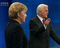 Berlin (AFP) Sept 13, 2009 German Chancellor Angela Merkel and her rival, Frank-Walter Steinmeier, sparred Sunday on minimum wages and nuclear power in an otherwise tepid TV debate before elections in two weeks' time. The conservative Merkel and Steinmeier, her vice-chancellor and the Social Democrats' candidate, also tried to claim credit for the recent state-brokered rescue of automaker Opel and a drop in joblessness in the last four years. Merkel said she had presided over an economic boom until the crisis hit hard last year and that she could return the country to prosperity if she could link up with her partner of choice, the pro-business Free Democrats. "We can continue decisively on this path but preferably with a new government," she said at their only one-on-one debate of the campaign before the September 27 election. Steinmeier, like Merkel dressed in a black business suit, said any economic recovery must be accompanied by better salaries for German workers. "We are faced with a downward spiral for pay," he said, calling for a national minimum wage like that introduced in other major European economies. "Britain and France introduced them without a loss of jobs." Merkel said she favoured only sector-wide wage agreements, saying a national minimum wage risked being a job killer. The two candidates also stressed their differences on nuclear energy. Merkel's Social Democratic predecessor Gerhard Schroeder agreed to mothball the country's reactors by about 2020. The chancellor said Sunday that the nuclear power plants should stay open as a "bridge technology until renewable, affordable energy makes a transition possible". Steinmeier called nuclear energy dangerous. "That is the wrong way to go," he said of Merkel's plan. "We must maintain the phase-out of nuclear power." Despite occasional jousts, the debate quickly devolved into a tame policy discussion with a polite exchange of differing views. The chancellor and Steinmeier, who is also foreign minister, have worked together in a so-called grand coalition since 2005 and both would like to abandon the loveless marriage and link up with their partners of choice. But Merkel's conservatives are leading in polls by a double-digit margin and look likely to manage to form a ruling coalition with the Free Democrats. The televised debate was seen by many commentators as Steinmeier's last chance to rescue his bid to become chancellor, with 20 million viewers expected to watch. Share This Article With Planet Earth