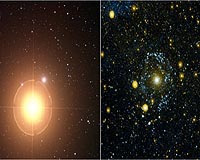 Pasadena CA (SPX) Nov 03, 2008 NASA's Galaxy Evolution Explorer has lifted the veil off a ghost known to haunt the local universe, providing new insight into the formation and evolution of galaxies. The eerie creature, called NGC 404, is a type of galaxy known as "lenticular." Lenticular galaxies are disk-shaped, with little ongoing star formation and no spiral arms. NGC 404 is the nearest example of a lenticular galaxy, and therefore of great interest. But it lies hidden in the glare from a red giant star called Mirach. For this reason, NGC 404 became known to astronomers as the "Ghost of Mirach." When the Galaxy Evolution Explorer spied the galaxy in ultraviolet light, a spooky ring materialized. "We thought this celestial ghost was essentially dead, but we've been able to show that it has an extended ring of new stars. The galaxy has a hybrid character in which the well-known, very old stellar population tells only part of the story," said David Thilker of Johns Hopkins University in Baltimore. "It's like the living dead." Thilker and members of the Galaxy Evolution Explorer team spotted the Ghost of Mirach in images taken during the space telescope's all-sky survey. The Galaxy Evolution Explorer is a relatively low-cost NASA mission, launched in 2003, with an ambitious charge to survey the entire visible sky in ultraviolet light, a job never before accomplished. Because Earth's atmosphere absorbs ultraviolet photons -- a good thing for us living creatures who are susceptible to the damaging light -- ultraviolet telescopes must operate from space. The first images of the Ghost of Mirach taken by the Galaxy Evolution Explorer hinted at a surrounding ultraviolet-bright extended structure. Subsequent, longer exposure observations indeed show that the lenticular galaxy is surrounded by a clumpy, never-before-seen ring of stars. What is this mysterious ultraviolet ring doing around an otherwise nondescript lenticular galaxy? As it turns out, previous imaging with the National Science Foundation's Very Large Array radio telescope in New Mexico had discovered a gaseous ring of hydrogen that matches the ultraviolet ring observed by the Galaxy Evolution Explorer. The authors of this Very Large Array study attributed the gas ring to a violent collision between NGC 404 and a small neighboring galaxy 900 million years ago. The ultraviolet observations demonstrate that, when the hydrogen from the collision settled into the plane of the lenticular galaxy, stars began to form in a ghostly ring. Young, relatively hot stars forming in stellar clusters sprinkled throughout NGC 404's ring give off the ultraviolet light that the Galaxy Evolution Explorer was able to see. "Before the Galaxy Evolution Explorer image, NGC 404 was thought to contain only very old and evolved red stars distributed in a smooth elliptical shape, suggesting a galaxy well into its old age and no longer evolving significantly," said Mark Seibert of the Observatories of the Carnegie Institution of Washington in Pasadena, Calif. "Now we see it has come back to life, to grow once again." "The Ghost of Mirach has been lucky enough to get a new lease on life through the rejuvenating, chance merger with its dwarf companion," added Thilker. The findings indicate that the evolution of lenticular galaxies might not yet be complete. They may, in fact, continue to form stars in a slow, piecemeal fashion as they suck the raw, gaseous material for stars from small, neighboring galaxies. It seems the Ghost of Mirach might act more like a vampire than a ghost. Caltech leads the Galaxy Evolution Explorer mission and is responsible for science operations and data analysis. NASA's Jet Propulsion Laboratory in Pasadena, Calif., manages the mission and built the science instrument. The mission was developed under NASA's Explorers Program managed by the Goddard Space Flight Center, Greenbelt, Md. Researchers sponsored by Yonsei University in South Korea and the Centre National d'Etudes Spatiales (CNES) in France collaborated on this mission. Community Email This Article Comment On This Article Related Links Galaxy Evolution Explorer Stellar Chemistry, The Universe And All Within It