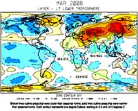 Huntsville AL (SPX) Apr 24, 2008 The La Nina cooling of the tropical atmosphere continued in March, with temperatures in the tropics falling to their coldest seasonally-adjusted temperature (-0.49 C below the 20-year average for March) since the La Nina of March 1989, according to Dr. John Christy, a professor of atmospheric science and director of the Earth System Science Center (ESSC) at The University of Alabama in Huntsville (UAH). Tropical temperatures in March 1989 dropped -0.72 C (1.3 degrees Fahrenheit) below seasonal norms. Global trend since Nov. 16, 1978: +0.14 C per decade March temperatures (preliminary): - Global composite temp.: +0.09 C (about 0.16 degrees Fahrenheit) above 20-year average for March. - Northern Hemisphere: +0.43 C (about 0.77 degrees Fahrenheit) above 20-year average for March. - Southern Hemisphere: - 0.25 C (about 0.45 degrees Fahrenheit) below 20-year average for March. February temperatures (revised): - Global Composite: + 0.02 C above 20-year average - Northern Hemisphere: + 0.25 C above 20-year average - Southern Hemisphere: - 0.21 C below 20-year average (All temperature variations are based on a 20-year average (1979-1998) for the month reported.) Community Email This Article Comment On This Article Related Links Color maps of local temperature anomalies Processed temperature data University of Alabama Huntsville Weather News at TerraDaily.com