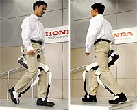 Tokyo (AFP) Nov 7, 2008 Honda Motor, a pioneer of humanoid robots, on Friday unveiled a new walking assist machine designed to make it easier for the elderly to climb stairs and help factory workers. The computerised leg device is the latest addition to walking technology developed by the Japanese automaker, which announced the world's first two-legged walking robot, ASIMO, in 2000. The 6.5 kilogramme (14.3-pound) device -- consisting of a saddle, leg-like frames and shoes -- can reduce the load on users' legs while walking or climbing and descending stairs by supporting bodyweight, Honda said. Honda said the motor-powered machine is still at an experimental stage, but elderly people and people undergoing rehabilitation who need support for their leg muscles and joints are the main target. The device is also expected to help assembly workers to keep a crouching position, Honda said, adding that it plans to test the device at one of its factories north of Tokyo. Like with a unicycle, users ride on the seat sustained by frames that can bend and extend like knees with two motors controlled by signals from sensors inside the shoes. "We used ASIMO's technology for developing the walking assist device," Masato Hirose, a senior engineer at Honda Research and Development, told AFP. "ASIMO is designed to be used as a tool, but the walking assist device is designed to complement real human bodies," he said. "Both will exist for the sake of people." ASIMO, which resembles a child in an astronaut suit, has been used as a receptionist and master of ceremonies at home and overseas, while dancing and singing with musicians at concerts. Honda has yet to decide on further details such as when the latest device will go on sale and at what price, but the company sees a market for it in Japan, which has an ageing population. "First, we hope to have visible results in rehabilitation and other medical fields," Hirose said. "Then we will look at welfare as another target." Last year, Honda unveiled its first walking assist device with a stride management system, which can help users move their thighs back and forth. Share This Article With Planet Earth