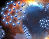 NASA's Spitzer Space Telescope has spotted the signature of flat carbon flakes, called graphene, in space. If confirmed, this would be the first-ever cosmic detection of the material - which is arranged like chicken wire in flat sheets that are one atom thick. Graphene was first synthesized in a lab in 2004, and subsequent research on its unique properties garnered the Nobel Prize in 2010. It's as strong as it is thin, and conducts electricity as well as copper. Some think it's the "material of the future," with applications in computers, screens on electrical devices, solar panels and more. Graphene in space isn't going to result in any super-fast computers, but researchers are interested in learning more about how it is created. Understanding chemical reactions involving carbon in space may hold clues to how our own carbon-based selves and other life on Earth developed. Spitzer identified signs of the graphene in two small galaxies outside of our own, called the Magellanic Clouds, specifically in the material shed by dying stars, called planetary nebulae. The infrared-sensing telescope also spotted a related molecule, called C70, in the same region - marking the first detection of this chemical outside our galaxy. C70 and graphene belong to the fullerene family, which includes molecules called "buckyballs," or C60. These carbon spheres contain 60 carbon atoms arranged like a soccer ball, and were named after their resemblance to the architectural domes of Buckminister Fuller. C70 molecules contain 70 carbon atoms and are longer in shape, more like a rugby ball. Fullerenes have been found in meteorites carrying extraterrestrial gases, and water has been very recently encapsulated in buckyballs by using new laboratory techniques. These findings suggest fullerenes may have helped transport materials from space to Earth long ago, possibly helping to kick-start life. Spitzer definitively detected both buckyballs and C70 in space for the first time in July 2010. It later spotted buckyballs - equivalent in mass to 15 full moons - in the Small Magellanic Cloud. These latter results demonstrated that, contrary to what was previously believed, fullerenes and other complex molecules could form in hydrogen-rich environments. According to astronomers, the graphene, buckyballs and C70 might be forming when shock waves generated by dying stars break apart hydrogen-containing carbon grains. The team that performed the Spitzer research is led by Domingo Anibal Garcia-Hernandez of the Instituto de Astrofisica de Canarias in Spain. The results appear in the Astrophyscial Journal Letters. Garcia-Hernandez is also the lead author of the study that used Spitzer to detect heaps of buckyballs in the Small Magellanic Cloud.