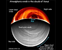 Paris, France (ESA) Sep 19, 2008 It is well known that winds on Venus are extremely fast and powerful. Now, ESA's Venus Express has, for the first time, put together a 3-D picture of the venusian winds for an entire planetary hemisphere. The most powerful atmospheric investigator ever sent to Venus, Venus Express has an advantageous orbit around the planet and a unique set of instruments. The spacecraft has the ability to peer through Venus's thick atmospheric layers and obtain a truly global picture. The spacecraft has continuously monitored the planet since observations began in 2006, and scientists now have enough data to start building a complete picture of the planet's atmospheric phenomena. The Venus Express Visual and Infrared Thermal Imaging Spectrometer, VIRTIS, has been studying the thick blanket of clouds that surround Venus, gathering data on the winds. The area studied spans altitudes of 45 to 70 km above the surface and covers the entire southern hemisphere, up to the equator. It is above the southern hemisphere that Venus Express reaches its highest point in orbit (about 66 000 km), allowing the instruments to obtain a global view. Agustin S�nchez-Lavega, from the Universidad del Pa�s Vasco in Bilbao, Spain, led the research on 3-D wind mapping with data from the first year of VIRTIS observations. "We focused on the clouds and their movement. Tracking them for long periods of time gives us a precise idea of the speed of the winds that make the clouds move and of the variation in the winds," he said. Tracking the clouds at different altitudes is possible only if the instrument is able to look through the curtain of clouds. "VIRTIS operates at different wavelengths, each of which penetrates the cloud layer to a different altitude," added Ricardo Hueso, also from the Universidad del Pa�s Vasco, co-author of the results. "We studied three atmospheric layers and followed the movement of hundreds of clouds in each. This has never been done before at such large temporal and spatial scales, and with multi-wavelength coverage." In total, the team tracked 625 clouds at about 66 km altitude, 662 at around 61 km altitude, and 932 at about 45-47 km altitude, on the day and night sides of the planet. The individual cloud layers were imaged over several months for about 1-2 hours each time. "We have learnt that between the equator and 50-55 degrees latitude south, the speed of the winds varies a lot, from about 370 km/h at a height of 66 km down to about 210 km/h at 45-47 km", said S�nchez-Lavega. "At latitudes higher than 65 degrees, the situation changes dramatically - the huge hurricane-like vortex structure present over the poles takes over. All cloud levels are pushed on average by winds of the same speed, independently of the height, and their speed drops to almost zero at the centre of the vortex." S�nchez-Lavega and colleagues observed that the speed of the zonal winds (which blow parallel to the lines of latitude) strongly depend on the local time. The difference in the Sun's heat reaching Venus in the mornings and in the evenings - called the solar tide effect - influences the atmospheric dynamics greatly, making winds blow more strongly in the evenings. On average, the winds regain their original speeds every five days, but the mechanism that produces this periodicity needs further investigation. "VIRTIS is continuing its observations, and over the next few years we expect to understand more precisely how stable or variable the venusian winds at the upper and lower cloud layers are," concluded Giuseppe Piccioni, from the Istituto Nazionale di Astrofisica in Rome, Italy, co-Principal Investigator for the VIRTIS instrument. Community Email This Article Comment On This Article Related Links VenusExpress Venus Express News and Venusian Science