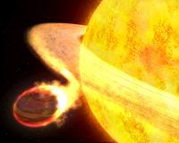 Hubble Finds A Star Eating A PlanetBaltimore MD (SPX) May 24, 2010 The hottest known planet in the Milky Way galaxy may also be its shortest-lived world. The doomed planet is being eaten by its parent star, according to observations made by a new instrument on NASA's Hubble Space Telescope, the Cosmic Origins Spectrograph (COS). The planet may only have another 10 million years left before it is completely devoured. The planet, called WASP-12b, is so clos ... read more |