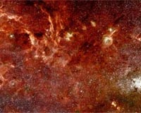 Baltimore MD (SPX) Jan 09, 2009 This composite color infrared image of the center of our Milky Way galaxy reveals a new population of massive stars and new details in complex structures in the hot ionized gas swirling around the central 300 light-years. This sweeping panorama is the sharpest infrared picture ever made of the Galactic core. It offers a nearby laboratory for how massive stars form and influence their environment in the often violent nuclear regions of other galaxies. This view combines the sharp imaging of the Hubble Space Telescope's Near Infrared Camera and Multi-Object Spectrometer (NICMOS) with color imagery from a previous Spitzer Space Telescope survey done with its Infrared Astronomy Camera (IRAC). The Galactic core is obscured in visible light by intervening dust clouds, but infrared light penetrates the dust. The spatial resolution of NICMOS corresponds to 0.025 light-years at the distance of the galactic core of 26,000 light-years. Hubble reveals details in objects as small as 20 times the size of our own solar system. Share This Article With Planet Earth
