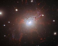 Cambridge, UK (SPX) Aug 21, 2008 The Hubble Space Telescope has found the answer to a long- standing puzzle by resolving giant but delicate filaments shaped by a strong magnetic field around the active galaxy NGC 1275. It is the most striking example of the influence of these immense tentacles of extragalactic magnetic fields, say researchers. NGC 1275 is one of the closest giant elliptical galaxies and lies at the centre of the Perseus Cluster of galaxies. It is an active galaxy, hosting a supermassive black hole at its core, which blows bubbles of radio-wave emitting material into the surrounding cluster gas. Its most spectacular feature is the lacy filigree of gaseous filaments reaching out beyond the galaxy into the multi-million degree X-ray emitting gas that fills the cluster. These filaments are the only visible-light manifestation of the intricate relationship between the central black hole and the surrounding cluster gas. They provide important clues about how giant black holes affect their surrounding environment. A team of astronomers using the NASA/ESA Hubble Space Telescope Advanced Camera for Surveys have for the first time resolved individual threads of gas which make up the filaments. The amount of gas contained in a typical thread is around one million times the mass of our own Sun. They are only 200 light-years wide, are often surprisingly straight, and extend for up to 20 000 light-years. The filaments are formed when cold gas from the galaxy's core is dragged out in the wake of rising bubbles blown by the black hole. It has been a challenge for astronomers to understand how the delicate structures withstood the hostile high-energy environment of the galaxy cluster for more than 100 million years. They should have heated up, dispersed, and evaporated over a very short period of time, or collapsed under their own gravity to form stars. Even more puzzling is the fact that they haven't been ripped apart by the strong tidal pull of gravity in the cluster's core. A new study led by Andy Fabian from the University of Cambridge, UK, published in Nature on 21 August 2008 proposes that the magnetic fields hold the charged gas in place and resist forces that would distort the filaments. This skeletal structure has been able to contain and suspend these peculiarly long threads for over 100 million years. "We can see that the magnetic fields are crucial for these complex filaments - both for their survival and for their integrity", said Fabian. The new Hubble data also allowed the strength of the magnetic fields in the filaments to be determined from their size. Thinner filaments are more fragile, requiring stronger magnetic fields for support. However, the finer the filaments, the more difficult they are to observe. The filamentary system in NGC 1275 provides the most striking example of the workings of extragalactic magnetic fields so far and is a spectacular by-product of the complex interaction between the cluster gas and the supermassive black hole at the galaxy's heart. Similar networks of filaments are found around many other, even more remote, central cluster galaxies. They cannot be observed in anything like the detail of NGC 1275, so the team will apply the understanding gained here to interpret observations of these more distant galaxies. Community Email This Article Comment On This Article Related Links Institute of Astronomy, University of Cambridge Stellar Chemistry, The Universe And All Within It