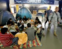Los Angeles (AFP) Oct 22, 2007 Hundreds of thousands of people fled as out-of-control wind-whipped wildfires raged across California on Monday, threatening homes and stretching emergency services to breaking point. At least 13 fires were blazing throughout southern California with thousands of firefighters struggling to contain flames that have ripped through tinder-try hillsides and parkland following months of record-low rainfalls. One person has been killed, more than 20 people injured and 90,000 acres (36,500 hectares) destroyed in the fires, which forced the evacuation of an estimated 250,000 people in the San Diego County alone. California Governor Arnold Schwarzenegger, who has declared a state of emergency in seven counties to help battle the flames, described the escalating crisis as a "tragedy" for the state. "It's a tragic time for California," Schwarzenegger said after touring charred remains of buildings in the celebrity enclave of Malibu, west of Los Angeles, where fires which erupted early Sunday have wreaked havoc. As well as firefighters on the ground, authorities bombarded the blazes from above using helicopters and airplanes to drop water and flame retardant. Fire authorities admit they are struggling to control the fires and are grimly expecting the situation to worsen as powerful, hot desert winds gust across the region this week. "These fires that are sweeping through Southern California are a perfect storm," said Los Angeles County supervisor Zev Yaroslavsky. "The fire department and law enforcement personnel have been stressed almost beyond the point of reason because there are so many fires going mutual aid has been stressed to their limits. This is a perfect firestorm. "The winds are erratic and unpredictable. There is no telling where the fires will move and when." Officials in San Diego County confirmed an estimated 250,000 people had been evacuated as the fires raced towards built-up residential areas. Among the evacuees were prison inmates and hospital patients, while several schools were also closed. Evacuees were being sent to Qualcomm Stadium, the home of the San Diego Chargers' American football team. San Diego Fire Rescue spokesman Maurice Luque said the wildfires were more serious than the blazes which ravaged California in 2003, leaving 22 people dead and destroying 3,000 homes. "We believe this is worse than 2003," Luque told AFP. "The winds have been just incessant, continuous. The focal point is constantly changing, which makes them extremely difficult to tackle. "It's hot, it's windy, it's smoky. It's got into residential areas. It's an extraordinarily challenging environment for our firefighters. "Our resources are stretched extremely thin at the moment." In Malibu, residents were struggling to come to terms with damage inflicted by the blaze on Sunday, when the Malibu Presbyterian Church and the 17-million-dollar Malibu Castle were razed to the ground on Sunday. Thousands of residents have been evacuated, including the homes of "Titanic" director James Cameron and "Grease" movie star Olivia Newton-John among those evacuated. TMZ.com reported on Monday that the exclusive Promises rehabilitation center, which has hosted troubled stars Britney Spears and Lindsay Lohan, was being evacuated. The causes of the different fires raging throughout the state varied, with a fallen power line believed to be the cause of the blaze in Malibu while arson was blamed for a fire in Orange County that torched 7,500 acres. One person was killed and four firefighters were seriously injured while trying to protect a home from fire in Potrero, 50 kilometers (30 miles) east of San Diego, the fire department said. Seventeen people were injured. Early Monday the fire had ripped through 20,000 acres of brush and was threatening 1,500 structures as it raced to the Mexico border, a spokeswoman from the California Department of Forestry and Fire Protection told AFP. Many parts of California, including Los Angeles, have experienced record low rainfalls this year, leaving hundreds of thousands of acres of countryside at the mercy of wildfires. Community Email This Article Comment On This Article Related Links Forest and Wild Fires - News, Science and Technology