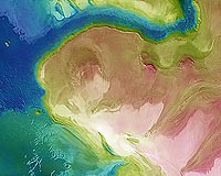 Paris, France (ESA) Mar 10, 2009 ESA's Mars Express orbiter imaged the snow-laden region of Rupes Tenuis on the martian north pole on 29 July 2008. The images are centred around 81 degrees north and 297 degrees east and have a ground resolution of 41 m/pixel. They cover an area of about 44 000 km2, almost as large as the Netherlands. Rupes Tenuis is located at the southern edge of the martian north polar cap, approximately 5500 km northeast of the Tharsis volcanic region. At present, polar caps contain the largest water reservoir on the Red Planet. Recent data from the Mars Advanced Radar for Subsurface and Ionosphere Sounding (MARSIS) on board Mars Express has revealed that both polar ice caps are 3.5 km thick. The deep water-ice polar cap is covered by a layer of carbon dioxide ice that is centimetres to decimetres thick. During the warmer summer months, most of the carbon dioxide ice sublimates directly to vapour, and escapes into the atmosphere, leaving behind the harder water-ice layers. Darker material, mostly dust, is brought in by the wind, and snow and ice are deposited in colder periods. This interplay between sedimentation and ice formation forms the Polar Layered Deposits visible clearly in the images. Small, conical mounds have long been interpreted as being volcanic in origin. New data suggest that some of the mounds may be remnants of older material that covered the area earlier. This material may have been more resistant to erosion, forming the mounds. Share This Article With Planet Earth