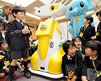 Fukuoka, Japan (AFP) March 25, 2008 Japanese parents who can't find a good babysitter now have an alternative that never gets tired -- a friendly robot at the local department store. Major Japanese retailer Aeon Co. said Tuesday it has introduced a 1.4-metre (four-foot-seven) yellow-and-white robot at a store in the southern city of Fukuoka in charge of entertaining the children. If parents want to leave their children with the kid-sized machine, they arrange for the youngsters to wear special badges that bear codes which the robot can read. The robot can then identify the children by their names and ages and chat with them, even though its vocabulary remains limited. The robot, developed with leading robot-maker Tmusk, can also use a projector in one of its eyes to beam advertising messages -- or to show pictures that it has captured with a camera installed in the other eye. Tmsuk and Aeon plan to further develop the technology to put robots to other uses. Future possibilities include robots that guide customers through the aisles of the store, filling their carts. Another objective is to make sure that children are accustomed to robots, which are expected to be increasingly common in day-to-day life in Japan. With Japan's population in decline, companies have put humanoids to use as security guards, receptionists and in other functions. Community Email This Article Comment On This Article Related Links All about the robots on Earth and beyond!