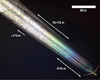 Bonn, Germany (SPX) Apr 03, 2009 Not all condensation trails are the same. Scientists from the German Aerospace Center have, for the first time, been able to describe how condensation trails are created not only from the exhaust gas of jet engines but, under certain conditions, also by the wings of aeroplanes. It is unclear to what extent this new class of condensation trail influences climate change, as up until now it has not been considered in climate models. The cause of the condensation trails, which are initially very thin and can only be observed directly behind an aeroplane at cruising altitude under certain conditions, is the rapid decrease in pressure above the wings of an aeroplane. Due to the drop in pressure, the temperature of the air falls in a few hundredths of a second and, provided that there is sufficient moisture in the air, tiny ice particles are formed. Scientists from the DLR Institute of Atmospheric Physics (Institut fur Physik der Atmosphare) in Oberpfaffenhofen have, for the first time, been able to conclusively describe the formation mechanism for aerodynamic condensation trails. "We have developed a physical model with which we have been able to explain the observations of aerodynamic condensation trails very precisely", says the institute's Professor Bernd Karcher. Extremely small ice particles of uniform size are formed in the steady stream over the wings that, provided sufficient water vapour is present in the atmosphere, continue to grow evenly at first. This even growth is also the reason for the iridescence of the condensation trail. At a distance of around 50 metres behind the aeroplane the ice particles are still small and they reflect blue light in particular; the larger the ice particles become - that is, the further they are from the aeroplane - the longer the wavelength of the light they reflect. The colour of the condensation cloud thus changes from blue to green to yellow and finally enters the red part of spectrum. After around 175 metres, the condensation trail appears white because the ice particles are drawn, little by little, into the turbulence of the wake behind the aeroplane. Here, the ice particles no longer grow evenly; due to their different sizes they reflect the light diffusely at all wavelengths and therefore appear white.