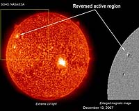 Huntsville AL (SPX) Dec 17, 2007 The solar physics community is abuzz this week. No, there haven't been any great eruptions or solar storms. The source of the excitement is a modest knot of magnetism that popped over the sun's eastern limb on Dec. 11th, pictured below in a pair of images from the orbiting Solar and Heliospheric Observatory (SOHO). It may not look like much, but "this patch of magnetism could be a sign of the next solar cycle," says solar physicist David Hathaway of the Marshall Space Flight Center. For more than a year, the sun has been experiencing a lull in activity, marking the end of Solar Cycle 23, which peaked with many furious storms in 2000--2003. "Solar minimum is upon us," he says. The big question now is, when will the next solar cycle begin? It could be starting now. "New solar cycles always begin with a high-latitude, reversed polarity sunspot," explains Hathaway. "Reversed polarity " means a sunspot with opposite magnetic polarity compared to sunspots from the previous solar cycle. "High-latitude" refers to the sun's grid of latitude and longitude. Old cycle spots congregate near the sun's equator. New cycle spots appear higher, around 25 or 30 degrees latitude. The region that appeared on Dec. 11th fits both these criteria. It is high latitude (24 degrees N) and magnetically reversed. Just one problem: There is no sunspot. So far the region is just a bright knot of magnetic fields. If, however, these fields coalesce into a dark sunspot, scientists are ready to announce that Solar Cycle 24 has officially begun. Many forecasters believe Solar Cycle 24 will be big and intense. Peaking in 2011 or 2012, the cycle to come could have significant impacts on telecommunications, air traffic, power grids and GPS systems. (And don't forget the Northern Lights!) In this age of satellites and cell phones, the next solar cycle could make itself felt as never before. The furious storms won't start right away, however. Solar cycles usually take a few years to build to a frenzy and Cycle 24 will be no exception. "We still have some quiet times ahead," says Hathaway. Meanwhile, all eyes are on a promising little active region. Will it become the first sunspot of a new solar cycle? Stay tuned for updates from Science@NASA. Community Email This Article Comment On This Article Related Links Solar Science News at SpaceDaily