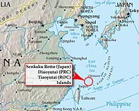 Tokyo (AFP) Oct 28, 2007 Japan's Coast Guard Sunday dispatched patrol ships and aircraft after spotting a boat carrying Chinese activists to a group of disputed islands claimed by Japan, China and Taiwan. "We have spotted a boat near the Japanese territorial sea on the western side of the islands," said a coast guard official based in the southern Japanese island chain of Okinawa. The Coast Guard sent patrol ships and planes to the area and gave warnings to the boat, said the official. The vessel briefly entered Japanese waters but left following the warnings, Kyodo news agency said. The boat carrying four Chinese activists protesting against Japan's control over the islands -- called the Senkaku Islands in Japan and Diaoyu in China, which lie between Taiwan and Japan -- set off Friday from China's Fujian province, Jiji Press reported. The activists tried to land on the islands but were blocked by the Japanese coast guard, it said. Japan claimed the islands in 1895 but they were temporarily put under US control after World War II and returned to Japan in 1972 together with Okinawa. In the early 1970s China and Taiwan made claims to the islands after oil deposits were confirmed in the area by a United Nations agency. In March 2004 Japanese authorities arrested and deported seven Chinese activists after they went to the islands, causing a diplomatic row with Beijing. Community Email This Article Comment On This Article Related Links Powering The World in the 21st Century at Energy-Daily.com