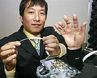 Tokyo (AFP) June 26, 2007 A Japanese robot maker on Tuesday unveiled what it called the world's first prototype of an artificial hand with "air muscles" that can do even delicate work like picking up a raw egg. Squse, a Kyoto-based robot and factory automation manufacturer, said it has developed a 400-gramme (14 ounce) hand with five human-sized fingers with artificial fibres that can be controlled by air pressure. "So far, robots have an image of helping people do heavy lifting, but we aim at delicate work as a human hand can do," company president Mikio Shimizu said. During a demonstration, the prototype hand grasped a pen and picked up a raw egg without breaking it. The firm plans to ship some 50 prototypes to research institutes and firms, with plans to market them overseas in the near future, Shimizu said. Air muscles may be key technology for developing new types of artificial hands in the future, said Hiroshi Yokoi, associate professor of precision engineering at the University of Tokyo. "Compared to motor-driven ones, air muscle hands are extremely light and less noisy," Yokoi said, adding that they may be in practical use in about five years' time.