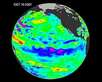 Pasadena CA (SPX) Nov 08, 2007 "After eight very dry years on the Colorado River watershed and a record-breaking dry winter in Southern California in 2006-2007, the situation in the American Southwest is dangerously dry," said oceanographer Bill Patzert of NASA's Jet Propulsion Laboratory, Pasadena, Calif. "This La Nina could deepen the drought in the already parched Southwest and Southeast United States." Patzert and other scientists say La Nina contributed to the conditions that fueled Southern California's recent deadly wildfires. A La Nina situation often follows an El Nino episode and is essentially the opposite of an El Nino condition. During a La Nina, trade winds are stronger than normal, and the cold water that normally exists along the coast of South America extends to the central equatorial Pacific. A La Nina changes global weather patterns and is associated with less moisture in the air, resulting in less rain along the coasts of North and South America, the equator and in the far Western Pacific. Jason will continue to track this change in Pacific climate. This image of the Pacific Ocean was produced using sea-surface height measurements taken by Jason. The image is based on the average of 10 days of data centered on October 16, 2007, compared to the long-term average of observations from 1993 through 2005. In the image, places where the Pacific sea surface height is higher (warmer) than normal are yellow and red, and places where the sea surface is lower (cooler) than normal are blue and purple. Green shows where conditions are near normal. Sea-surface height is an indicator of the heat content of the upper ocean. The comings and goings of El Nino and La Nina are part of a longer evolving state of global climate, of which sea-surface height is a useful indicator. The Jason follow-on mission, Ocean Surface Topography Mission/Jason-2, is scheduled for launch next June and will extend the data record to a span of two decades. Community Email This Article Comment On This Article Related Links NASA's ocean surface topography missions Water News - Science, Technology and Politics