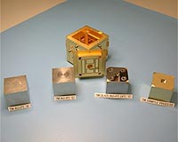 The 'precious' core of the LTP The proof mass is a cube of 46 mm on a side, weighing about 1.96 kg, and made from a special alloy of approximately 73% gold and 27% platinum (see Figure 2). This alloy has been specifically chosen in order to minimise the susceptibility of the material to external magnetic fields. In order to fulfil its experimental role the proof mass must not be perturbed by magnetic fields generated by the spacecraft electrical units or those intrinsic to interplanetary space. The proof masses are in many senses the 'precious' core of LISA Pathfinder, as they are the material bodies that will follow a pure free-fall trajectory during the mission. They will also be the gravitational wave sensors in the LISA spacecraft.