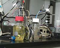 Tempe AZ (SPX) Jan 04, 2008 Researchers at the Biodesign Institute are using the tiniest organisms on the planet 'bacteria' as a viable option to make electricity. In a new study featured in the journal Biotechnology and Bioengineering, lead author Andrew Kato Marcus and colleagues Cesar Torres and Bruce Rittmann have gained critical insights that may lead to commercialization of a promising microbial fuel cell (MFC) technology. "We can use any kind of waste, such as sewage or pig manure, and the microbial fuel cell will generate electrical energy," said Marcus, a Civil and Environmental Engineering graduate student and a member of the institute's Center for Environmental Biotechnology. Unlike conventional fuel cells that rely on hydrogen gas as a fuel source, the microbial fuel cell can handle a variety of water-based organic fuels. "There is a lot of biomass out there that we look at simply as energy stored in the wrong place," said Bruce Rittmann, director of the center. "We can take this waste, keeping it in its normal liquid form, but allowing the bacteria to convert the energy value to our society's most useful form, electricity. They get food while we get electricity." Waste not Bacteria have such a rich diversity that researchers can find a bacterium that can handle almost any waste compound in their daily diet. By linking bacterial metabolism directly with electricity production, the MFC eliminates the extra steps necessary in other fuel cell technologies. "We like to work with bacteria, because bacteria provide a cheap source of electricity," said Marcus. There are many types of MFC reactors and research teams throughout the world (http://microbialfuelcell.org). However, all reactors share the same operating principles. All MFCs have a pair of battery-like terminals: an anode and cathode electrode. The electrodes are connected by an external circuit and an electrolyte solution to help conduct electricity. The difference in voltage between the anode and cathode, along with the electron flow in the circuit, generate electrical power. In the first step of the MFC, an anode respiring bacterium breaks down the organic waste to carbon dioxide and transfers the electrons released to the anode. Next, the electrons travel from the anode, through an external circuit to generate electrical energy. Finally, the electrons complete the circuit by traveling to the cathode, where they are taken up by oxygen and hydrogen ions to form water. What is the matrix? "We knew that the MFC process is relatively stable, but one of the biggest questions is: How do the bacteria get the electrons to the anode?" said Marcus. The bacteria depend on the anode for life. The bacteria at the anode breathe the anode, much like people breathe air, by transferring electrons to the anode. Because bacteria use the anode in their metabolism, they strategically position themselves on the anode surface to form a bacterial community called a biofilm. Bacteria in the biofilm produce a matrix of material so that they stick to the anode. The biofilm matrix is rich with material that can potentially transport electrons. The sticky biofilm matrix is made up of a complex of extracellular proteins, sugars, and bacterial cells. The matrix also has been shown to contain tiny conductive nanowires that may help facilitate electron conduction. "Our numerical model develops and supports the idea that the bacterial matrix is conductive," said Marcus. In electronics, conductors are most commonly made of materials like copper that make it easier for a current to flow through . "In a conductive matrix, the movement of electrons is driven by the change in the electrical potential." Like a waterfall, the resulting voltage drop in the electrical potential pushes the flow of electrons. The treatment of the biofilm matrix as a conductor allowed the team to describe the transport of electrons driven by the gradient in the electrical potential. The relationship between the biofilm matrix and the anode could now be described by a standard equation for an electrical circuit, Ohm's law. Within the MFC is a complex ecosystem where bacteria are living within a self-generated matrix that conducts the electrons. "The whole biofilm is acting like the anode itself, a living electrode," said Marcus. "This is why we call it the 'biofilm anode.'" Life at the Jolt The concept of the 'biofilm anode' allowed the team to describe the transport of electrons from bacteria to the electrode and the electrical potential gradient. The importance of electrical potential is well known in a traditional fuel cell, but its relevance to bacterial metabolism has been less clear. The next important concept the team had to develop was to understand the response of bacteria to the electrical potential within the biofilm matrix. Bacteria will grow as long as there is an abundant supply of nutrients. Jacques Monod, one of the founding fathers of molecular biology, developed an equation to describe this relationship. While the team recognized the importance of the Monod equation for bacteria bathed in a rich nutrient broth, the challenge was to apply the Monod equation to the anode, a solid. Previous studies have shown that the rate of bacterial metabolism at the anode increases when the electrical potential of the anode increases. The researchers could now think of the electrical potential as fulfilling the same role as a bacterial nutrient broth. The team recognized that the electrical potential is equivalent to the concentration of electrons; and the electrons are precisely what the bacteria transfer to the anode. Equipped with this key insight, the team developed a new model, the Nernst-Monod equation, to describe the rate of bacterial metabolism in response to the "concentration of electrons" or the electrical potential. Promise meeting potential In their model, the team identified three crucial variables to controlling an MFC: the amount of waste material (fuel), the accum