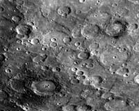 Laurel MD (SPX) Feb 25, 2008 As MESSENGER flew by Mercury on January 14, 2008, the Narrow Angle Camera (NAC) of the Mercury Dual Imaging System (MDIS) captured this view. Two of the larger craters in this image appear to have darkened crater rims and partial "halos" of dark material immediately surrounding the craters. Both craters appear to have nearly complete rims and interior terraced walls, suggesting that they formed more recently than the other nearby shallower craters of similar size. There are two possible explanations for their dark halos: 1/ Darker subsurface material may have been excavated during the explosions from the asteroid or comet impacts that produced the craters. 2/ Large cratering explosions may have melted a fraction of the rocky surface material involved in the explosions, splashing so-called "impact melts" across the surface; such melted rock is often darker (lower albedo) than the pre-impact target material. In either case, the association of the dark material with relatively recently formed craters suggests that the processes that gradually homogenize Mercury's surface materials have not yet had time to reduce the contrast of these dark halos. The crater with associated dark material in the lower-left part of this image is about 100 kilometers (60 miles) in diameter, and the crater with patches of dark material in the upper right is about 70 kilometers (40 miles) across. These dark-halo craters, located near Mercury's south pole, are also visible in the previously released false-color image created from three Wide Angle Camera (WAC) frames. Information from images taken in the 11 different color filters of the WAC will help MESSENGER scientists understand the nature of the dark material associated with the craters shown in this image and will determine whether they reveal the presence of subsurface material of a different composition, are examples of impact melt, or perhaps have some other explanation. Community Email This Article Comment On This Article Related Links MESSENGER's first flyby of Mercury News Flash at Mercury Mars News and Information at MarsDaily.com Lunar Dreams and more