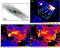 The results of mapping the center of NGC 253 The observational data produced line-ratio maps that allowed the scientists to determine the extent of the galactic wind as well as its mass and kinetic energy; to discover regions with enhanced nitrogen abundance; and to clearly distinguish shocked gas from starburst regions. Line-ratio maps show the relative intensity of line emissions and display their distribution; they are derived from emission lines that show peaks of radiation in a spectrum. The Kyoto team captured emission line images of sulfur, nitrogen, and hydrogen. Because sulfur emission lines are weaker than those of hydrogen and nitrogen, their images have been difficult to capture. Nevertheless, the large aperture of the Subaru Telescope helped the instrument obtain a sulfur emission line image for the first time. Since these line images did not show active galactic nuclei, the scientists could eliminate AGN as an energy source for NGC 253's galactic winds. The emission lines of nitrogen and the nitrogen/hydrogen ratios helped the scientists to conclude that shocks excited the galactic winds of NGC 253; their emission lines indicate sources of energy that shift gas particles in the wind from a lower to higher level, hence "exciting" it. There are two kinds of energy sources that excite gas: 1) the strong, abrupt motion of gas that creates shocks and 2) the thermal energy of stars. Based on nitrogen abundance in relation to hydrogen, the scientists can identify which regions in this galaxy are excited by shocks and which, by stars. Shocks are marked by a transition region that occurs when hydrogen and other elements are partly ionized; much of the sulfur and nitrogen are emitted in this region and the nitrogen/hydrogen ratio is large. In contrast, ultraviolet light from stars produces a completely ionized region, not a transition region; the nitrogen/hydrogen ratio is low. Maps of the nitrogen/hydrogen ratios confirmed that shocks rather than the thermal energy of stars are the driving source of NGC 253's galactic winds.