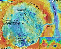 Paris, France (ESA) Mar 23, 2009 Mars Express has uncovered geological evidence suggesting that some depositional process, revealed by erosion, has been at work on large scales in the equatorial regions of the planet. If so, this would provide another jigsaw piece to be fitted into the emerging picture of Mars' past climate. The evidence comes from the mineralogical composition of the Aram Chaos region, a crater 280 km in diameter lying almost directly on the martian equator. Data from Mars Express' OMEGA instrument, the Visible and Infrared Mineralogical Mapping Spectrometer, has revealed that this region shows a significant amount of sulphates and ferric oxides. On Earth, ferric oxide is more commonly known as rust. Observations from Mars Express show that the bright red dust covering much of the planet is enriched in ferric oxides. Yet in the dark deposits of Aram Chaos, there is a four-fold increase in the spectral signature of ferric oxides, revealing a specific concentration mechanism. Ferric oxides are generally found with sulphates but, in this case, the lighter sulphates have been blown away, leaving the ferric oxides exposed. "They have accumulated in dark deposits at the bottom of sulphate cliffs," says Stephane Le Mouelic, Universite de Nantes, a member of the team who performed the investigation. This suggests that the ferric oxides have been uncovered by erosion before dropping to the base of the cliffs. The dunes in this region are also enriched in ferric oxides. Perhaps significantly, this phenomenon is not unique to the Aram Chaos region. The NASA Opportunity rover discovered ferric oxide deposits in Meridiani Planum, about 1000 km away. The scientists called the deposits 'blueberries', because of their spherical shape. Valles Marineris, 3000 km away, also shows similar deposits. So Mars Express' detection of ferric oxides in Aram Chaos links together widely separated areas of Mars. There may even be other regions that have witnessed the same accumulation process but now lie hidden from Mars Express' view. "OMEGA is sensitive to the first hundreds of microns of the surface. So, a layer of Martian dust just one millimetre thick will hide the signature from us," says Marion Masse, Universite de Nantes, lead author on the paper describing these results. Fortunately, in many regions of Mars, such as Aram Chaos, wind erosion has blown the dust cover away, leaving bulk rocks exposed. Although the true extent and nature of the accumulation process of sulphates and ferric oxides remains elusive, the team are now investigating possible hypotheses that could have caused it in the first place. At this stage, they are ruling nothing out. It could be anything from atmospheric precipitation such as rain or snow, to volcanic ashes or glacial deposits. Share This Article With Planet Earth