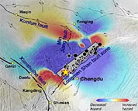Washington DC (SPX) Sep 16, 2008 Researchers analyzing the May 2008 Wenchuan earthquake in China's Sichuan province have found that geological stress has significantly increased on three major fault systems in the region. The magnitude 7.9 quake on 12 May has brought several nearby faults closer to failure and could trigger another major earthquake in the region. Geophysicists used computer models to calculate the changes in stress along the Xianshuihe, Kunlun, and Min Jiang faults, which lie about 150 to 450 kilometers (90 to 280 miles) from the Longmen Shan rupture that caused the devastating quake. The research team also examined seismic activity in the region over the past decade. The scientists found that the 12 May event has doubled the probabilities of future earthquakes on these fault lines. Specifically, they estimated the probability of another earthquake of magnitude 6 or greater in the region is 57 to 71 percent over the next decade. There is an 8 to 12 percent chance of a quake larger than magnitude 7 in the next decade and 23 to 31 percent in the next 30 years. The research team reported its findings on 9 September in Geophysical Research Letters, a journal of the American Geophysical Union (AGU). "One great earthquake seems to make the next one more likely, not less," says Ross S. Stein of the U.S. Geological Survey (USGS) in Menlo Park, California, a member of the team led by Shinji Toda of the Geological Survey of Japan, in Tsukuba. "We tend to think of earthquakes as relieving stress on a fault. That may be true for the one that ruptured, but not for the adjacent faults," Ross adds. In 1999, a magnitude 7.4 (M7.4) earthquake in Izmit, Turkey, was followed four months later by an M7.1 event in nearby Duzce. The devastating December 2004 Sumatra earthquake (M9.2) and tsunami were followed by an M8.7 quake three months later. "Because the Tibetan Plateau is one of the most seismically active regions in the world, we believe there is credible evidence for a new major quake in this region," says Jian Lin of the Woods Hole Oceanographic Institution (WHOI), who is also on the team. "The research community cannot forecast the timing of earthquakes, and there are still significant uncertainties in our models. But the Turkey and Sumatra events indicate that one major earthquake can indeed promote another." Researchers see it as a domino-like effect, where the movement of one piece of Earth's crust means that another piece must move up, down, or away. While the stress in the crust gets reduced in some locations, it is transferred to other faults nearby. Large aftershocks that occurred on 1 August and 5 August in the Sichuan region of China may fit with this predicted pattern. "Earthquake prediction is a bit like the thundercloud and lightning," Toda explains. "We can forecast that lightning will come from a thundercloud, but we cannot predict the exact time and place where the lightning will hit. With earthquakes, we can roughly forecast the probability of activity over broad ranges of time, magnitude, and location, but we cannot determine the exact value for any of these." On 12 May 2008, about 300 kilometers (190 miles)of the Longmen Shan fault zone ruptured in an earthquake that killed at least 69,000 people and left another 5 million homeless. It was the deadliest and strongest earthquake to hit China since the 1976 Tangshan earthquake, which killed at least 240,000. As pieces of the Longman Shan fault slipped by as much as nine meters (28 feet) in the May quake, stress increased along the neighboring Xianshuihe, Kunlun, and Min Jiang faults, according to Toda and colleagues. All three faults have a history of large quakes, though portions of each have been quiet for most of the past century. All three faults were considered to be primed for an earthquake even before the recent events. In addition to the broad prediction of earthquake triggering, the researchers have also forecasted the rate and distribution of seismic shocks greater than magnitude 6, a prediction that they plan to test from seismic stations over the next decade. "Our paper predicts the change in the rate of small earthquakes for the faults in the region, and now we can test that prediction," says Stein. "If the rate of shocks increases on the adjacent faults, then we can confirm at least part of our hypothesis that large shocks are also more likely. It may take time, but it is a testable hypothesis." In western China, the intrusion of the Indian sub-continent pushes the Tibetan Plateau up and over the older Sichuan Basin and other parts of the Eurasian continent. An estimated 33 percent of world's continental earthquakes occur in China, even though it only occupies 7 percent of the planet's land mass. Nearly 55 percent of all human loss to earthquakes occurs in China. "Earthquakes do not kill people, buildings do," says Lin, who was a high school student in China when the devastating Tangshan earthquake struck. "There needs to be widespread education in earthquake preparedness, as well as systematic inspection of buildings in these regions of heightened risk. Every new building inspection and evacuation plan could potentially save lives." "We hope the long-term forecasting allows the Chinese government to make it a priority to mitigate future damage," Toda adds. "We recommend that Chinese scientists carefully observe changes in seismicity by installing new seismometers in the region." Mustapha Meghraoui of the Institute of Geophysics in Strasbourg, France also collaborated on the research. Lin, Toda, and Stein were preparing to teach an earthquake modeling course to Meghraoui's students and colleagues in France when the 12 May earthquake occurred. The researchers immediately went into action, working with an international group of scientists to analyze the new stresses on the system. An early version of the manuscript by Toda et al. Was circulated to several dozen Chinese scientists and government officials a