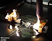 Washington DC (SPX) Nov 12, 2007 Researchers at the National Institute of Standards of Technology (NIST) and George Mason University have demonstrated what is probably the world's smallest microwave oven, a tiny mechanism that can heat a pinhead-sized drop of liquid inside a container slightly shorter than an ant and half as wide as a single hair. The micro microwave is intended for lab-on-a-chip devices that perform rapid, complex chemical analyses on tiny samples. In a paper in the November 2007 Journal of Micromechanics and Microengineering*, the research team led by NIST engineer Michael Gaitan describes for the first time how a tiny dielectric microwave heater can be successfully integrated with a microfluidic channel to control selectively and precisely the temperature of fluid volumes ranging from a few microliters (millionth of a liter) to sub-nanoliters (less than a billionth of a liter). Sample heating is an essential step in a wide range of analytic techniques that could be built into microfluidic devices, including the high-efficiency polymerase chain reaction (PCR) process that rapidly amplifies tiny samples of DNA for forensic work, and and methods to break cells open to release their contents for study. The team embedded a thin-film microwave transmission line between a glass substrate and a polymer block to create its micro microwave oven. A trapezoidal-shaped cut in the polymer block only 7 micrometers across at its narrowest-the diameter of a red blood cell-and nearly 4 millimeters long (approximately the length of an ant) serves as the chamber for the fluid to be heated. Based on classical theory of how microwave energy is absorbed by fluids, the research team developed a model to explain how their minature oven would work. They predicted that electromagnetic fields localized in the gap would directly heat the fluid in a selected portion of the micro channel while leaving the surrounding area unaffected. Measurements of the microwaves produced by the system and their effect on the fluid temperature in the micro channel validated the model by showing that the increase in temperature of the fluid was predominantly due to the absorbed microwave power. Once the new technology is more refined, the researchers hope to use it to design a microfluidic microwave heater that can cycle temperatures rapidly and efficiently for a host of applications. Community Email This Article Comment On This Article Related Links National Institute of Standards and Technology (NIST) Computer Chip Architecture, Technology and Manufacture Nano Technology News From SpaceMart.com