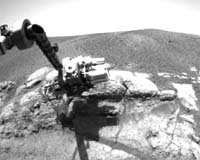 Pasadena CA (JPL) Apr 23, 2008Despite a slight increase in atmospheric opacity caused by dust, Spirit is still enjoying higher-than-expected energy levels for this time of year. Solar array input has been approximately 240 watt-hours per Martian day, or sol (100 watt-hours is the amount of energy needed to light a 100-watt bulb for one hour). |