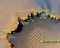 Pasadena CA (JPL) Jun 20, 2007Spirit got a second spring cleaning on Mars with a dust-cleaning event that increased power from the rover's solar arrays by 120 watt-hours (a 100-watt light bulb that burns for one hour uses 100 watt-hours of electricity). Spirit previously experienced dust-lifting winds in 2005. Energy from the rover's solar arrays is now higher than 600 watt-hours. |