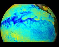Greenbelt MD (SPX) Jan 14, 2008 Cool, wet conditions in the Northwest, frigid weather on the Plains, and record dry conditions in the Southeast, all signs that La Nina is in full swing. With winter gearing up, a moderate La Nina is hitting its peak. And we are just beginning to see the full effects of this oceanographic phenomenon, as La Nina episodes are typically strongest in January. A La Nina event occurs when cooler than normal sea surface temperatures form along the equator in the Pacific Ocean, specifically in the eastern to central Pacific. The La Nina we are experiencing now has a significant presence in the eastern part of the ocean. The cooler water temperatures associated with La Nina are caused by an increase in easterly sea surface winds. Under normal conditions these winds force cooler water from below up to the surface of the ocean. When the winds increase in speed, more cold water from below is forced up, cooling the ocean surface. "With this La Nina, the sea-surface temperatures are about two degrees colder than normal in the eastern Pacific and that's a pretty significant difference," says David Adamec of NASA's Goddard Space Flight Center, Greenbelt, Md. "I know it doesn't sound like much, but remember this is water that probably covers an area the size of the United States. It's like you put this big air conditioner out there -- and the atmosphere is going to feel it." While this "air conditioner" may be located in the equatorial Pacific Ocean, it has a great influence on the weather here in the United States and across the globe. The cool water temperatures of a La Nina slow down cloud growth overhead, causing changes to the rainfall patterns from South American to Indonesia. These changes in rainfall affect the strength and location of the jet stream -- the strong winds that guide weather patterns over the United States. Since the jet stream regulates weather patterns, any changes to it will have a great impact on the United States. Those changes can be felt throughout the country. The Northwest generally experiences cooler, wetter weather during a La Nina. On the Great Plains, residents normally see a colder than normal winter and southeastern states traditionally experience below average rainfall. The cooler waters of a La Nina event also increase the growth of living organisms in this part of the ocean. La Ninas amplify the normal conditions in the Pacific. These typically cool and abundant waters experience an increase in phytoplankton growth when the water temperature drops even further. The increased circulation that brings up cold water from below also brings up with it nutrients from the deeper waters. These nutrients feed the organisms at the bottom of the food chain, starting a reaction that increases life in the ocean. NASA's SeaWiFS satellite documented this increase in phytoplankton during the last La Nina period in 1998. La Nina and El Nino episodes tend to occur every three to five years. La Ninas are often preceded by an El Nino, however this cycle is not guaranteed. The lengths of La Nina events vary as well. "We need to watch to see if this La Nina diminishes, because they can last for multiple years. And if it does last for multiple years, the southern tier of the United States, especially the Southeast, can expect dryer weather. That is not a good situation. If this La Nina behaves. So far this La Nina is behaving like a textbook case: following the predicted weather patterns, strengthening throughout the winter, and peaking toward January. According to NOAA's Climate Prediction Center, this La Nina episode is expected to continue until the spring of 2008, with a gradual weakening starting in February. NASA will continue to monitor this phenomenon with several of its key Earth observing satellites. Instruments on NASA's Terra and Aqua satellites measure sea surface temperature and observe changes to life in the ocean, changes of great importance to the fishing industry. The MODIS instruments on these satellites detected the temperature drop that signaled this La Nina period, and SeaWiFS continues to monitor ocean life. Scientists also look at sea surface height to understand La Nina. The cooler ocean water associated with a La Nina contracts, lowering sea-surface heights. Over the past year, NASA's Jason satellite has observed a lower than normal sea level along the equatorial Pacific where this current La Nina episode is taking place. NASA also looks at changes in wind and rain patterns to study La Nina. The QuikSCAT satellite measures changes in oceanic surface winds, while the Tropical Rainfall Measuring Mission satellite observes changes in rainfall. These observations add to a fuller understanding of this phenomenon. The current La Nina episode has far many reaching effects. What some may see as just a small change in sea surface temperature has a much greater impact on our climate here in the U.S. and across the globe, as well as implications for the fishing industry and the global economy. With the help of NASA's earth observing fleet, scientists are becoming better equipped to observe and understand this phenomenon. Community Email This Article Comment On This Article Related Links Goddard Space Flight Center El Nino, La Nina and an Ocean called Pacifica
